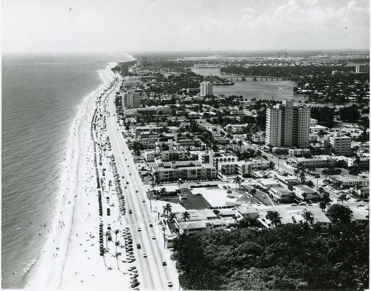 Aerial of A1A looking south along the beach. Birch Tower designed by architect, Charles McKirahan on right.Collection