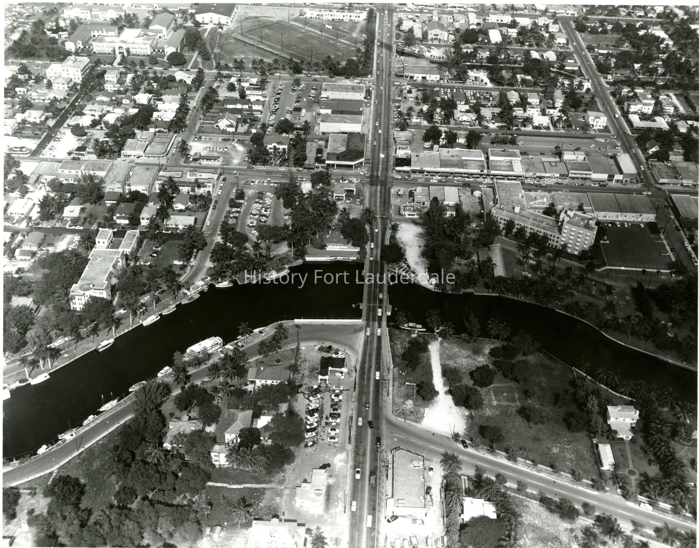 An aerial view of the Federal Highway showing the bridge which was replaced by a tunnel in December 1960. Just across the river to the left is the Stranahan Home. Also to the left in the background is the Fort Lauderdale High School where now in 1982 stands the Landmark Bank.Collection