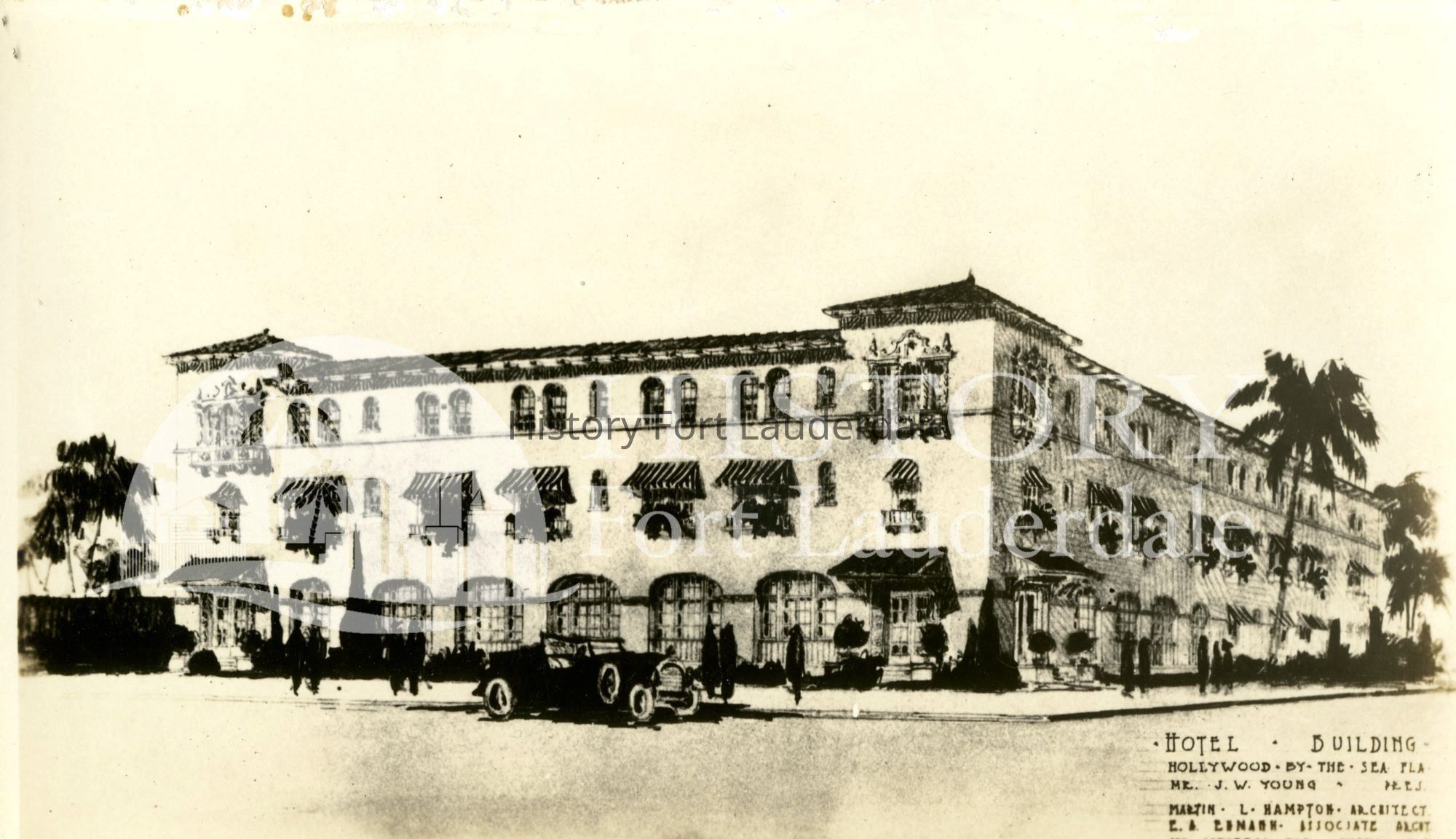 Photo of a drawing of Hotel--Building, Hollywood-By-The-Sea, Florida. ME. J. W. Young P.E.T.J.-. Martin L. Hampton, Architect , E. A. Einhan? , AN305XXXX Associate Architect, 809 Congress Bldg.,Miami. Florida. 1920'sCollection