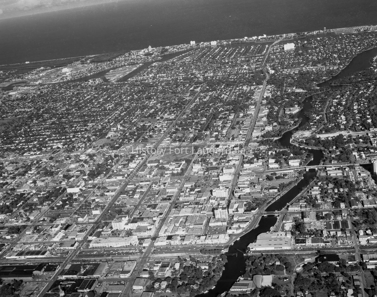 Aerial view of Fort Lauderdale looking east. New River pictured on the right, Florida East Coast Railroad (FEC) pictured along the bottom.Photograph Details
