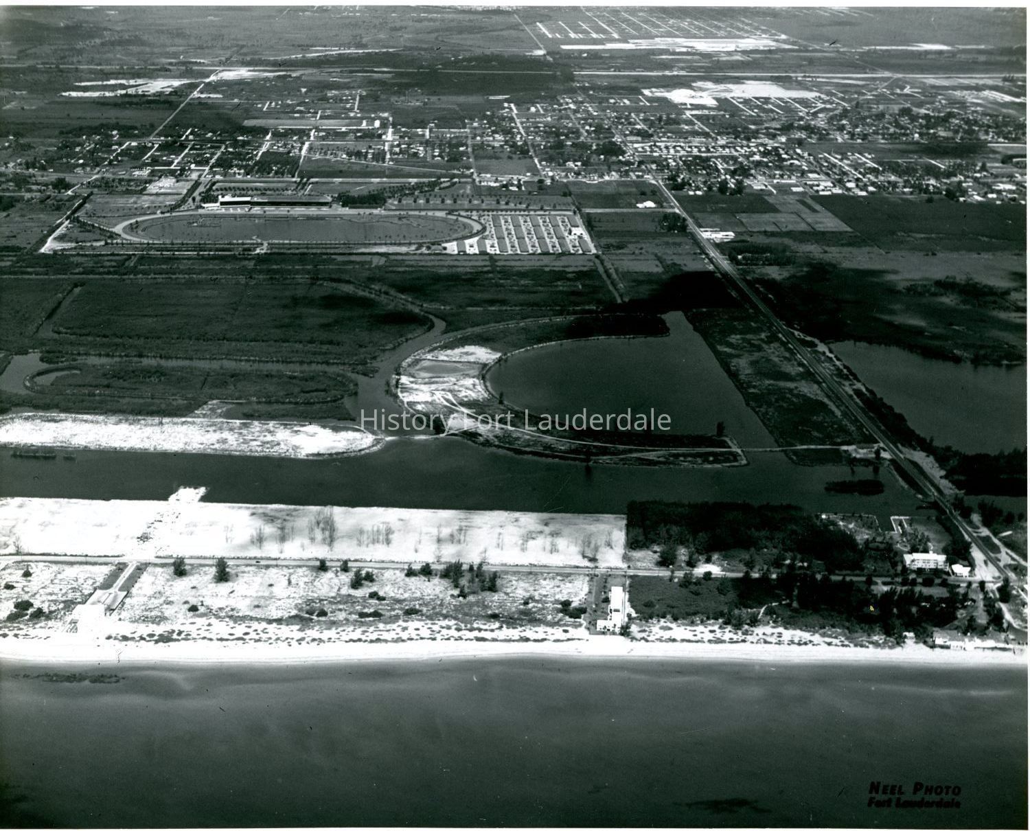 Aerial view looking west from the ocean. Racetrack in upper left center. Golden Isles development between beach and racetrack. Main road running from lower right to upper center is Hallandale Beach Boulevard. Road running left to right in upper part of image is Dixie Highway.Collection