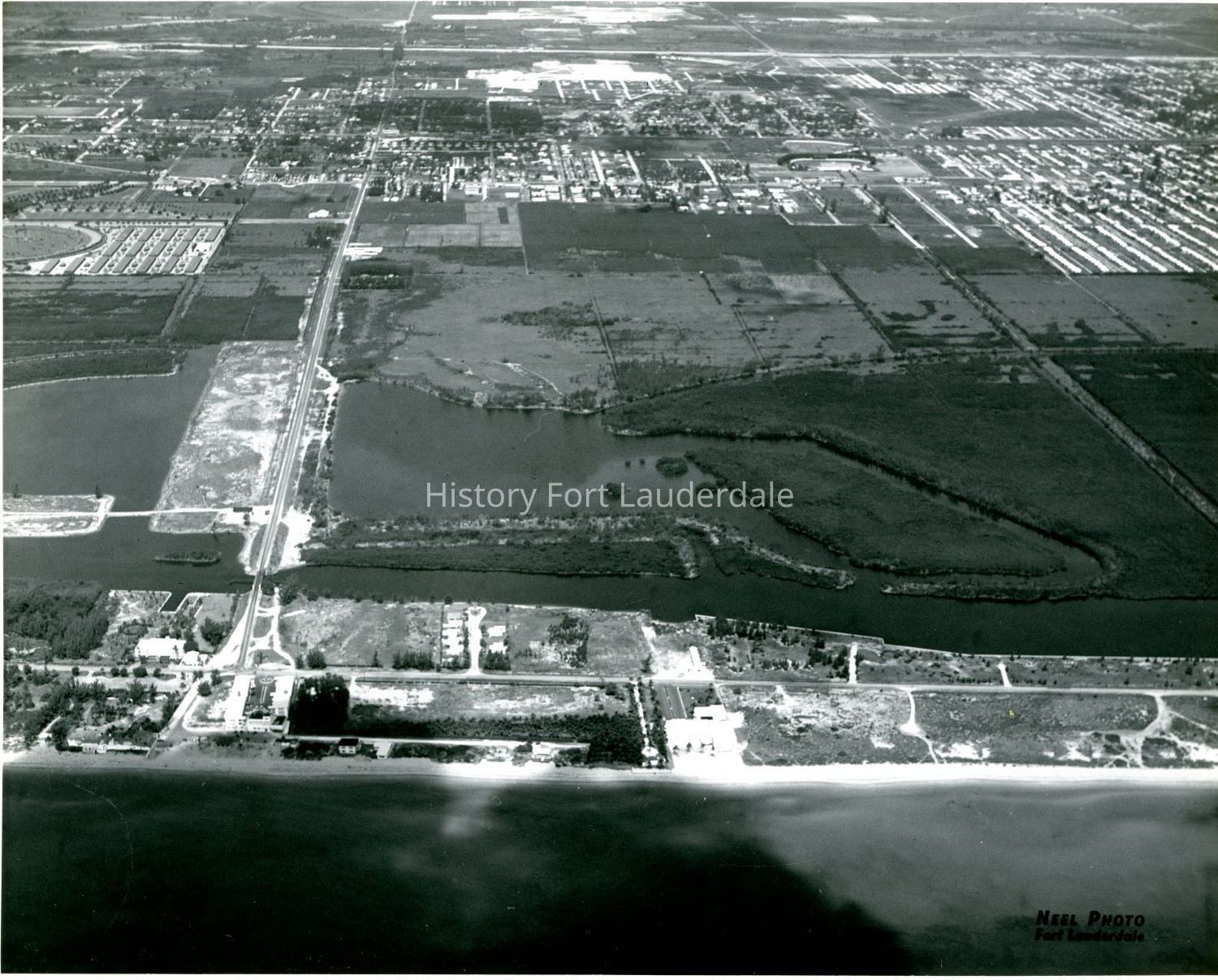 Aerial view looking west from the ocean. Racetrack in upper left. Three Islands development and Diplomat Golf Course in center. Hollywood Dog Track in upper right center. Main road (left) running from ocean to the west is Hallandale Beach Boulevard. Road running left to right in upper part of image is Dixie Highway.Collection