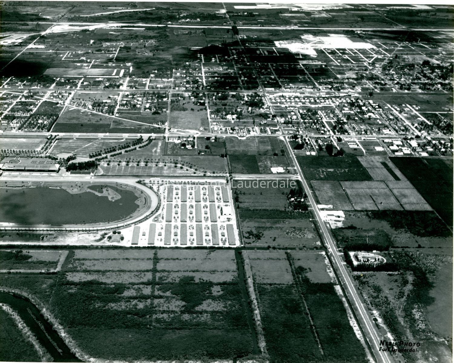 Aerial view looking west along Hallandale Beach Boulevard. Racetrack in left center. Federal Highway running left to right through center of image. Road running left to right in upper part of image is Dixie Highway.Collection