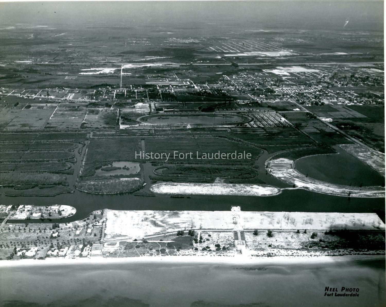 Aerial view looking west from the ocean. Racetrack in upper center. Golden Isles development between beach and racetrack.