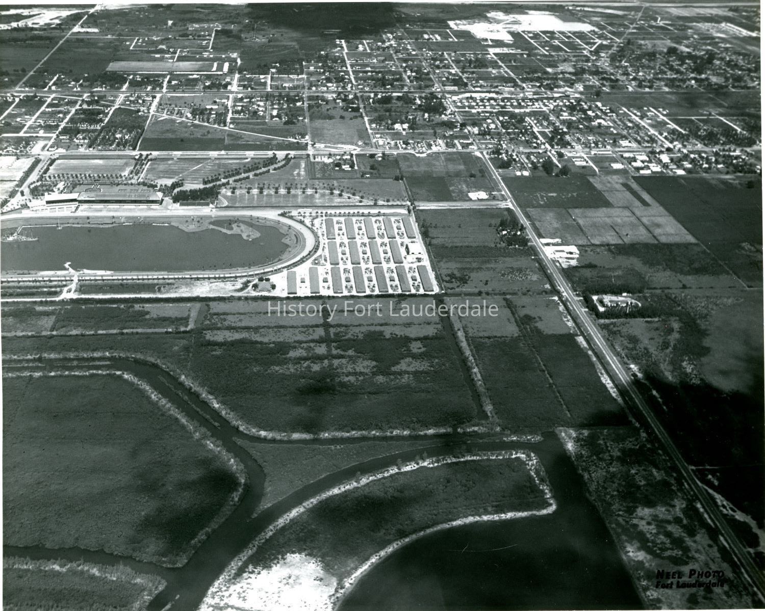 Aerial view looking west from the ocean. Racetrack in left center. Golden Isles development in the foregrouond. Main road running from lower right corner to upper right center is Hallandale Beach Boulevard. Road running left to right in upper part of image is Dixie Highway.Collection
