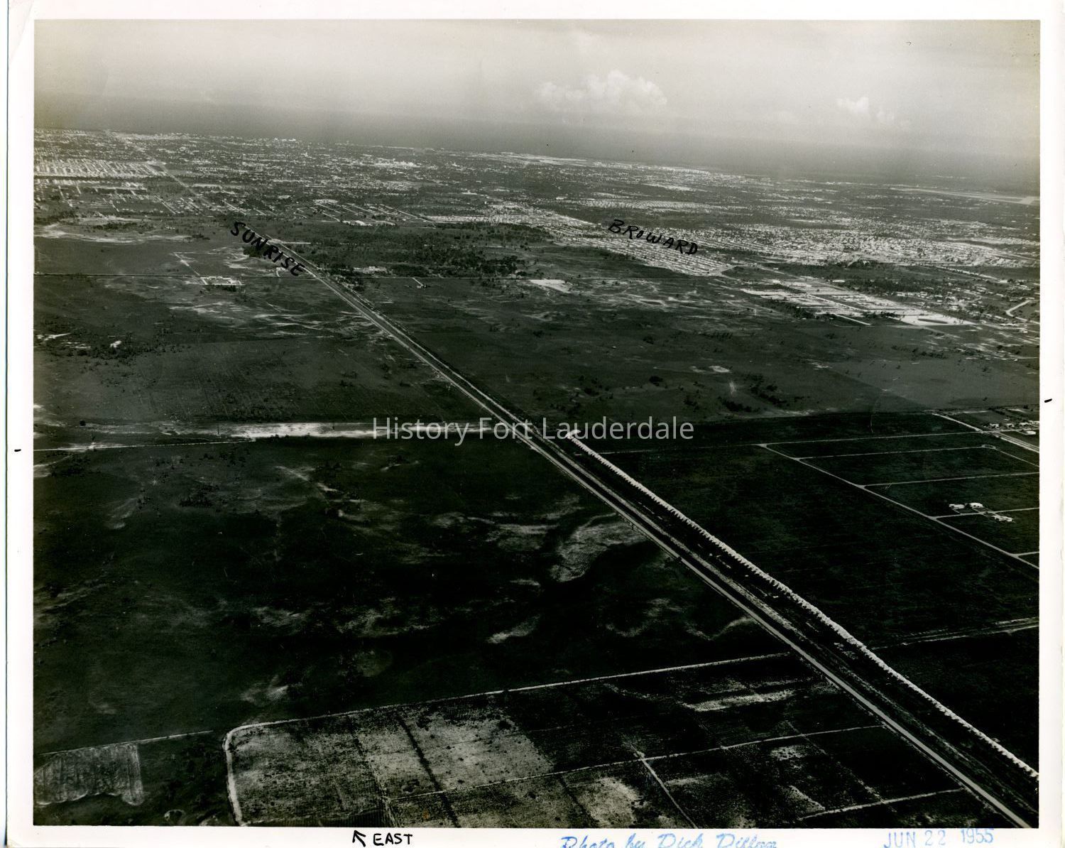Aerial view of Sunrise Boulevard looking southeast from ~NW 58th Ave and NW 16th Street in Sunrise. Area that will become the Florida Turnpike runs left to right through center of the image. Fort Lauderdale Airport in upper right.Collection