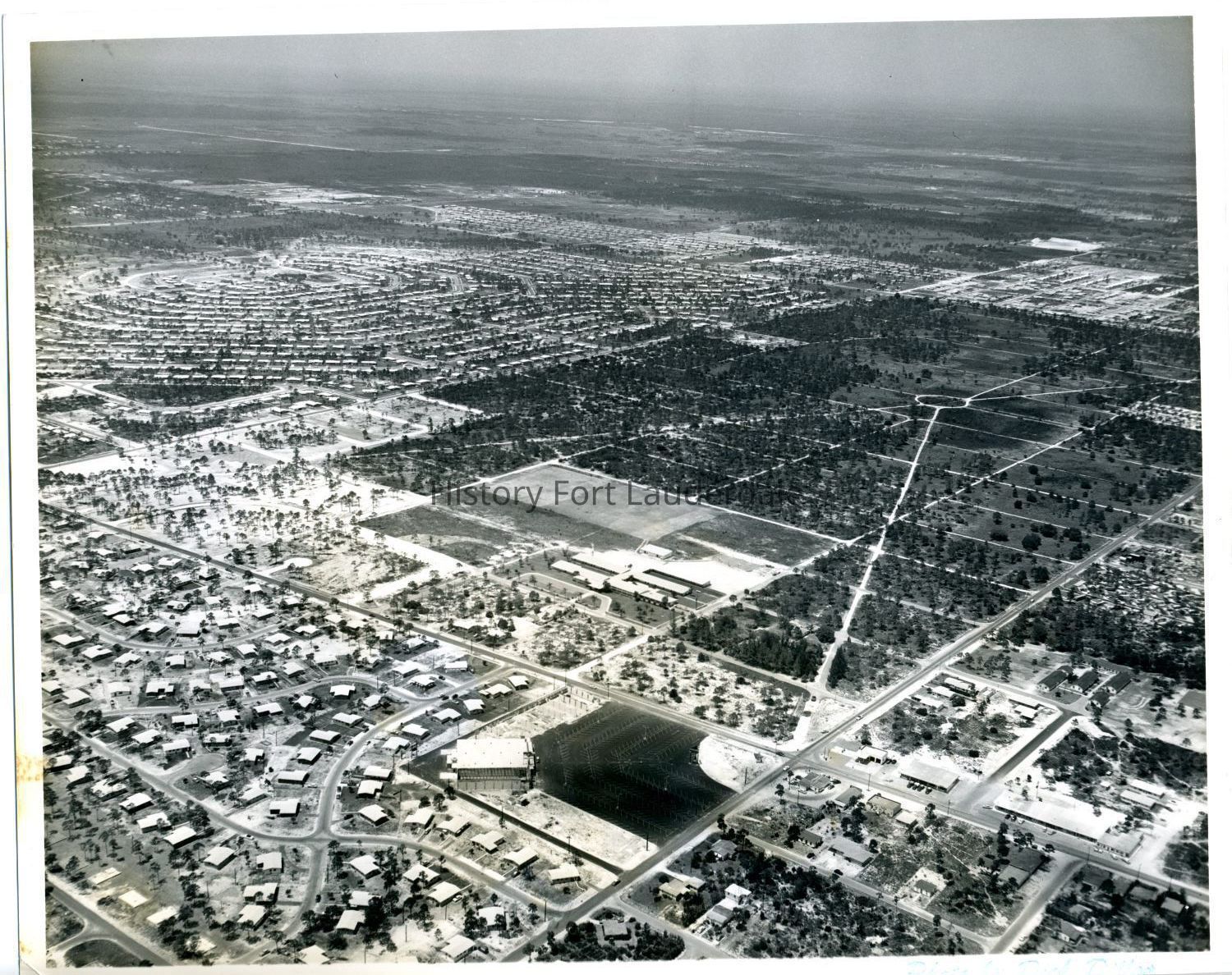 Aerial view of Melrose Park (upper left) looking northwest from intersection of Davie Boulevard and Riverland Road (SW 27th Avenue). St. Thomas Aquinas High School property in the center.Collection