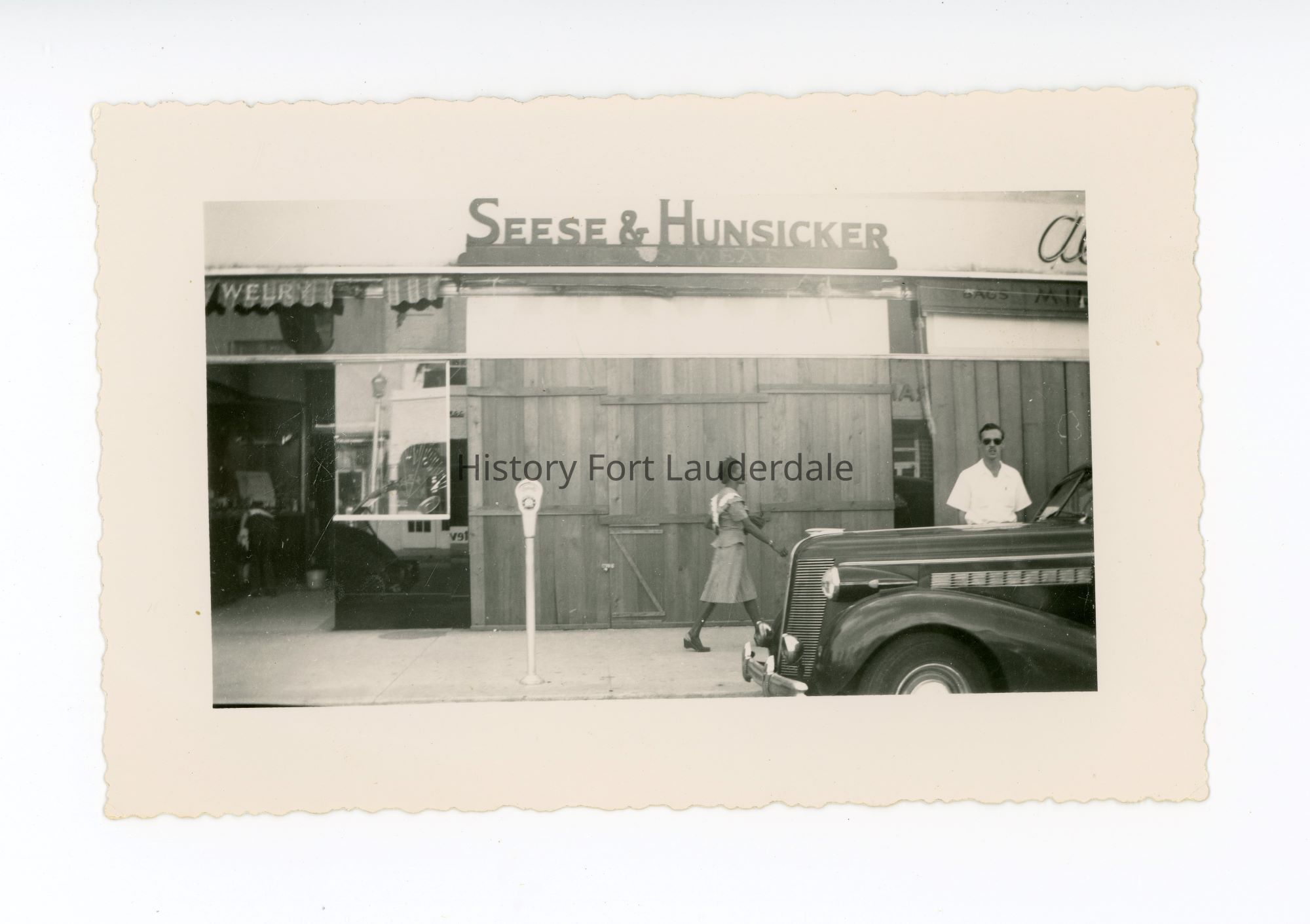 Boarded-up storefront of Seese & Hunsicker men's clothing store (208 South Andrews Avenue) . Car parked in front with man wearing sunglasses standing next to it. African-American woman walking by.Collection