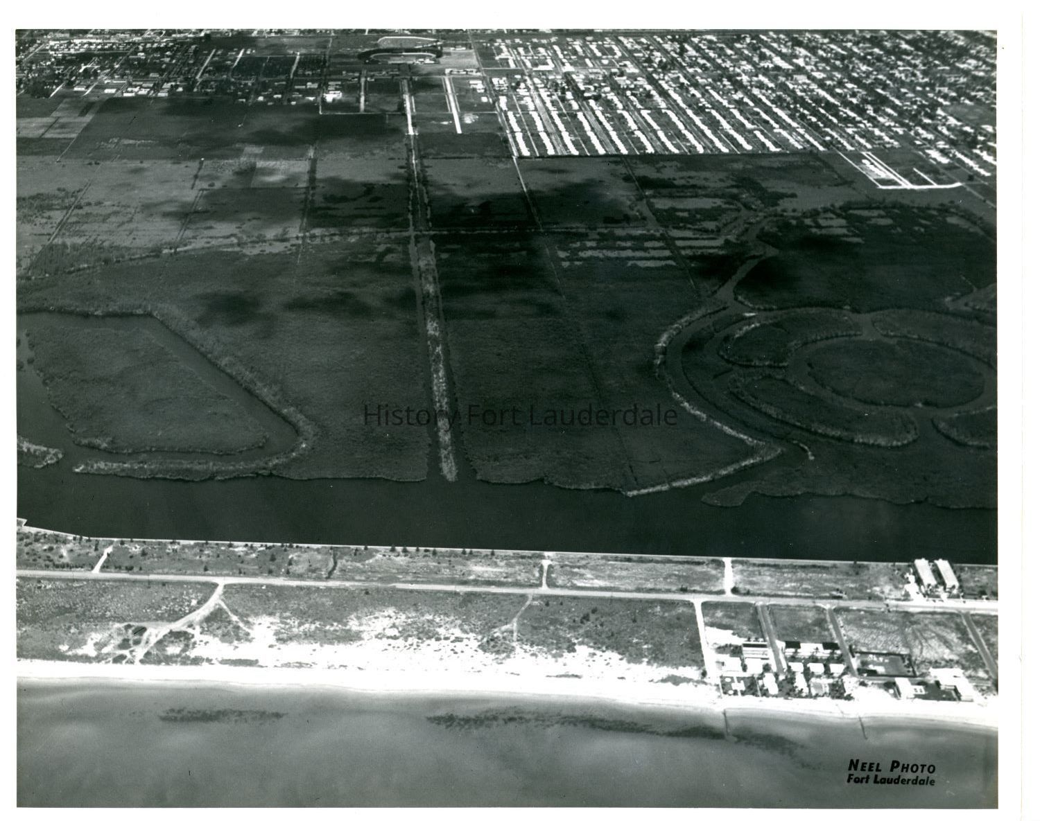 Aerial view of Hallandale looking west from the ocean. Undeveloped Three Island area in the center. Diplomat Golf Course property in upper left center. Hollywood Dog Track (Kennel Club) in top edge left center.Collection