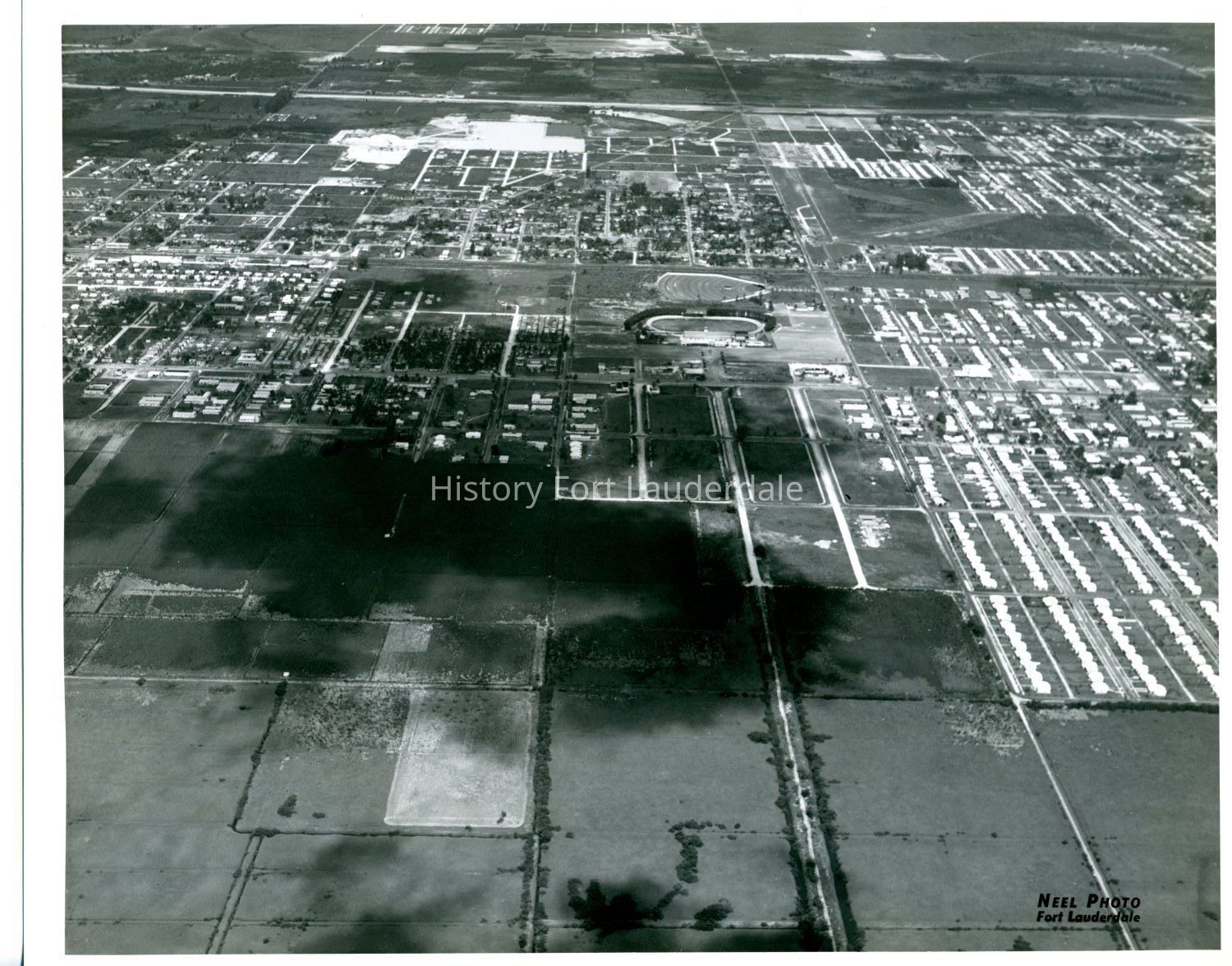 Aerial view of Hallandale looking west from ~NE 14th Avenue. Federal Highway and Dixie highway run left to right in upper center. Interstate 95 running left to right in upper part of the image. Hollywood Dog Track (Kennel Club) and Hallandale Drive In in center. Hollywood Air Park in upper right.Collection