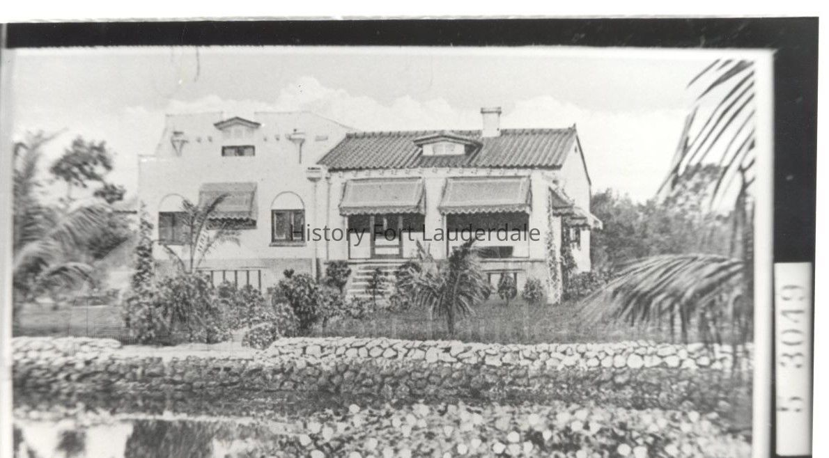 Two-story masonry structure. Left side of house has flat roof. Right side has gabled roof with Spanish tiles. Awnings on several windows. Canal in foreground. Home of Dr. & Mrs. Francis S. Skiff 1105 SE. 4th. St.Collection