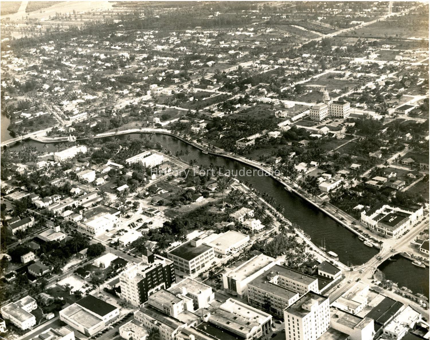 Aerial view looking southeast from downtown. Sweet Building, Hotel Broward, Governor's Club Hotel and Pioneer Department Store in lower center. Maxwell Arcade at right center edge. Broward County Courthouse in upper right center. Rio Vista in upper left.Collection