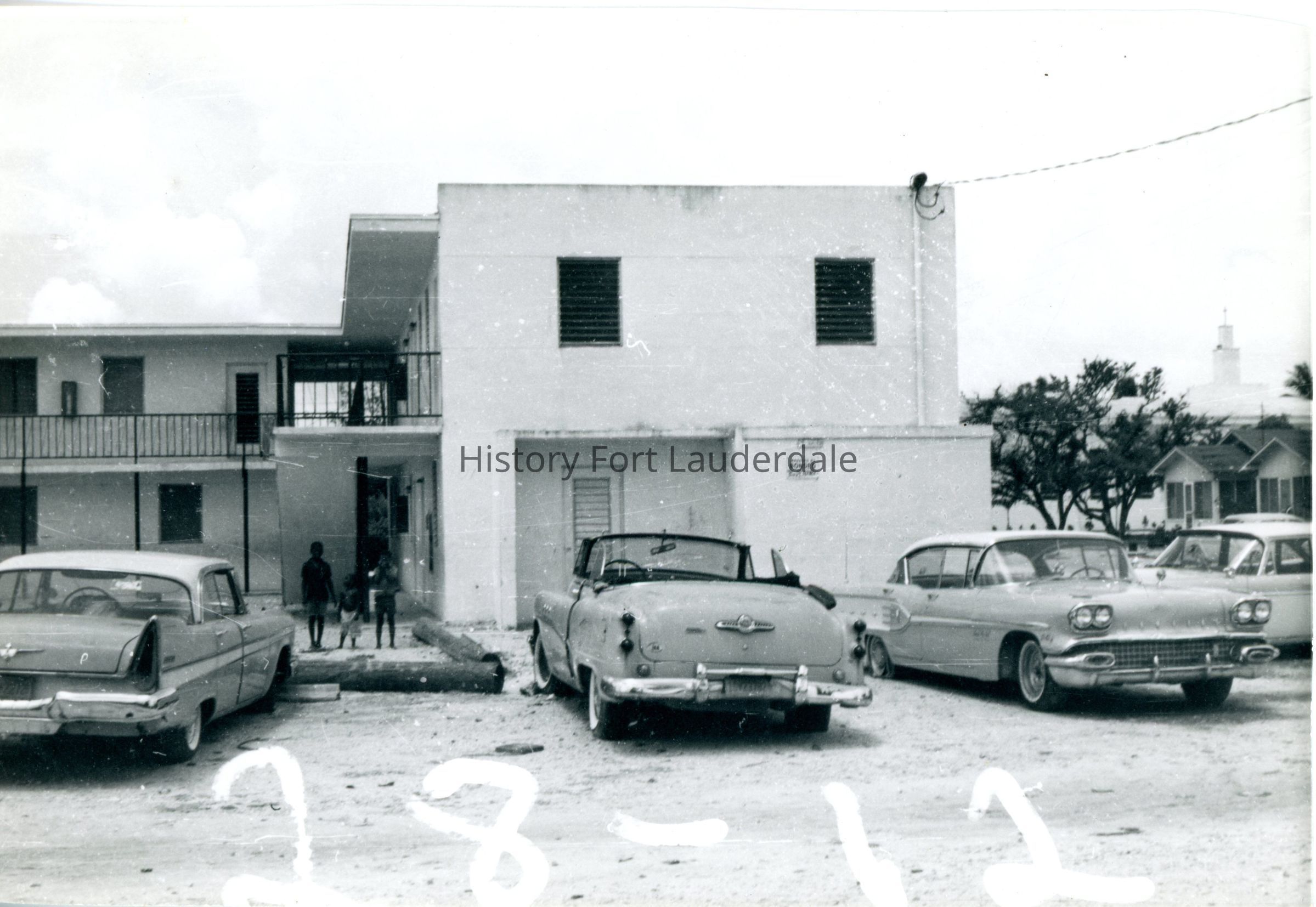 Two story concrete apartment building located at 801 NW 3rd Street with cars parked in front and three African American children standing in front.Collection