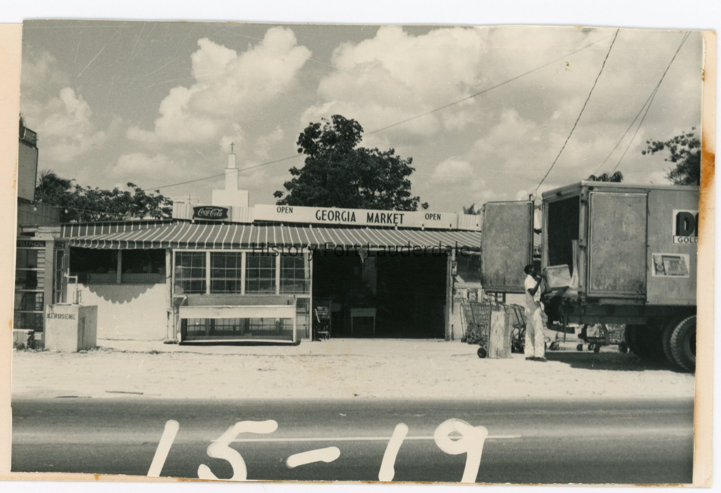 One story concrete building located at 405 NW 7th Avenue, Georgia Market. Telephone booth and kerosene storage container to the left. African-American man unloading truck.Collection
