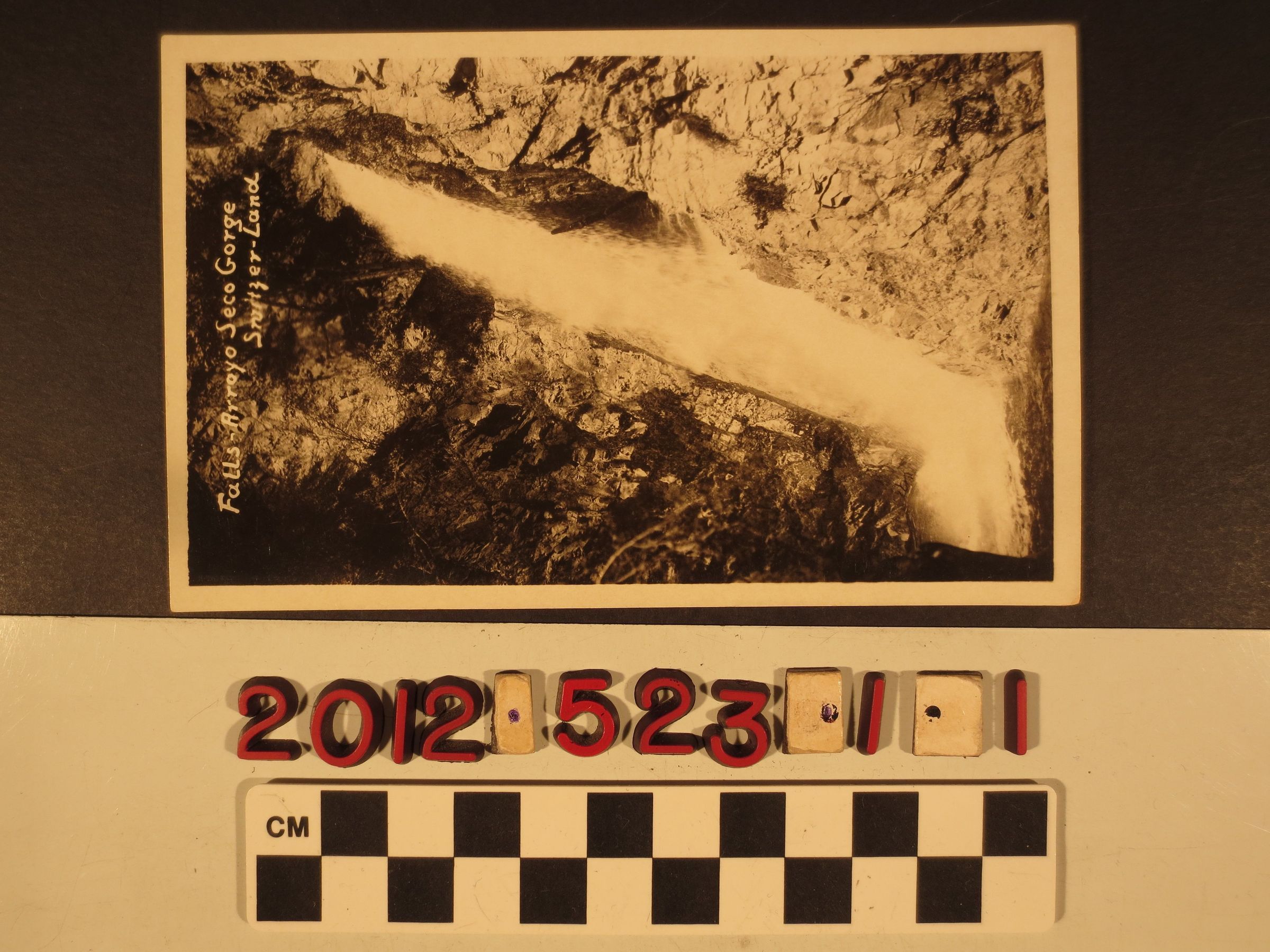 A real photo postcard, "Falls—Arroyo Seco Gorge / Switzer-Land," ca. 1924. The view is a close-up of the falls descending down several dozen feet down the rocky mountain side into a pool at the bottom. The caption is at the top. The postally unused card has some browning, very light soiling and minor edge abrasion and is in good condition.