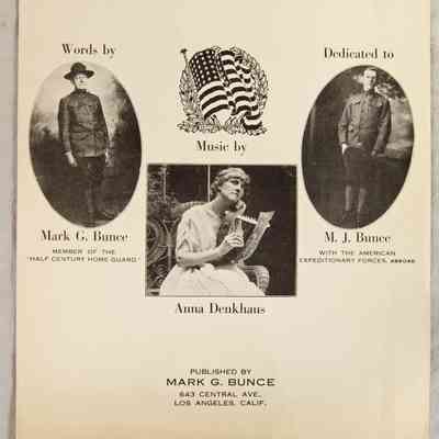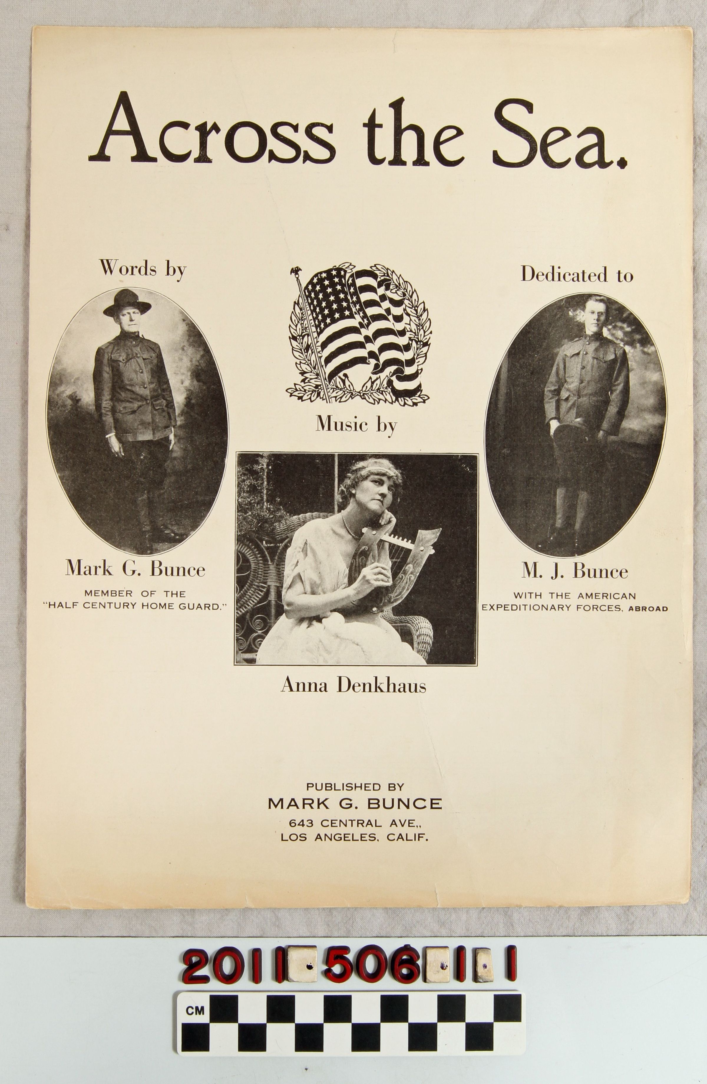 "Across the Sea," words by Mark G. Bunce and music by Anna Denkhaus, published by Bunce, Los Angeles, 1918. The patriotic war-time piece is in "con spirito" tempo over two pages of a score. On the front are photos of Bunce, in the uniform of the "Half Century Home Guard," Denkhaus holding a lyre and Bunce's son, M. J., serving in the American Expeditionary Forces in Europe. With some small tape-repaired tears at the bottom, creases, yellowing and light soiling, the general condition is good.Lexicon