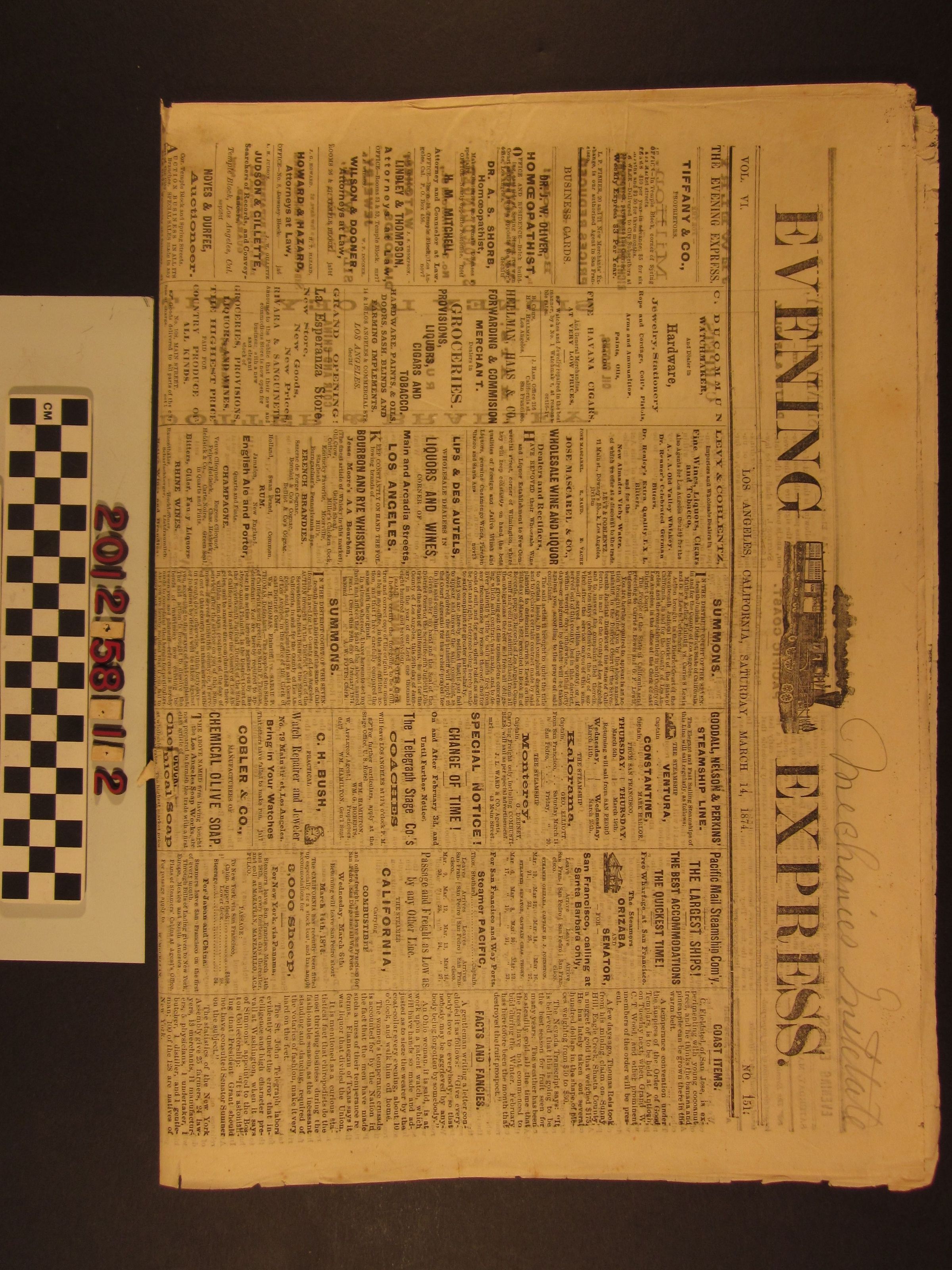 "Los Angeles Express," 14 March 1874. The condition is good.