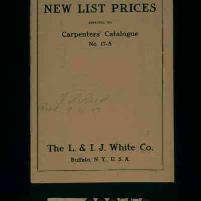 "New List Prices Applying to Carpenters' Catalogue: No. 17-A," issued by the L. & I. J. White Company, April 15, 1918. The 20-page booklet has a white paper cover with the date across the top and below this is the title. At the left of the center in pencil is, "F. S. Reed / Rec'd 9-11-19," At the center of the bottom is the name and address of the company. All of the printing on the cover, including a border around the front, is in black ink. Listed inside are the prices for all of the merchandise available in the catalog whcih inlcudes a variety of chisels; gougers; axes; adzes; ice choppers; calking irons and mallets; draw and machine knives; shaves; plane irons; and chisel and axe handles. The artifact was found within the catalog is item .1, along with a sheet which is .3. With small creases; dents and holes from staples; and acid burns, the object is in good condition overall.Lexicon