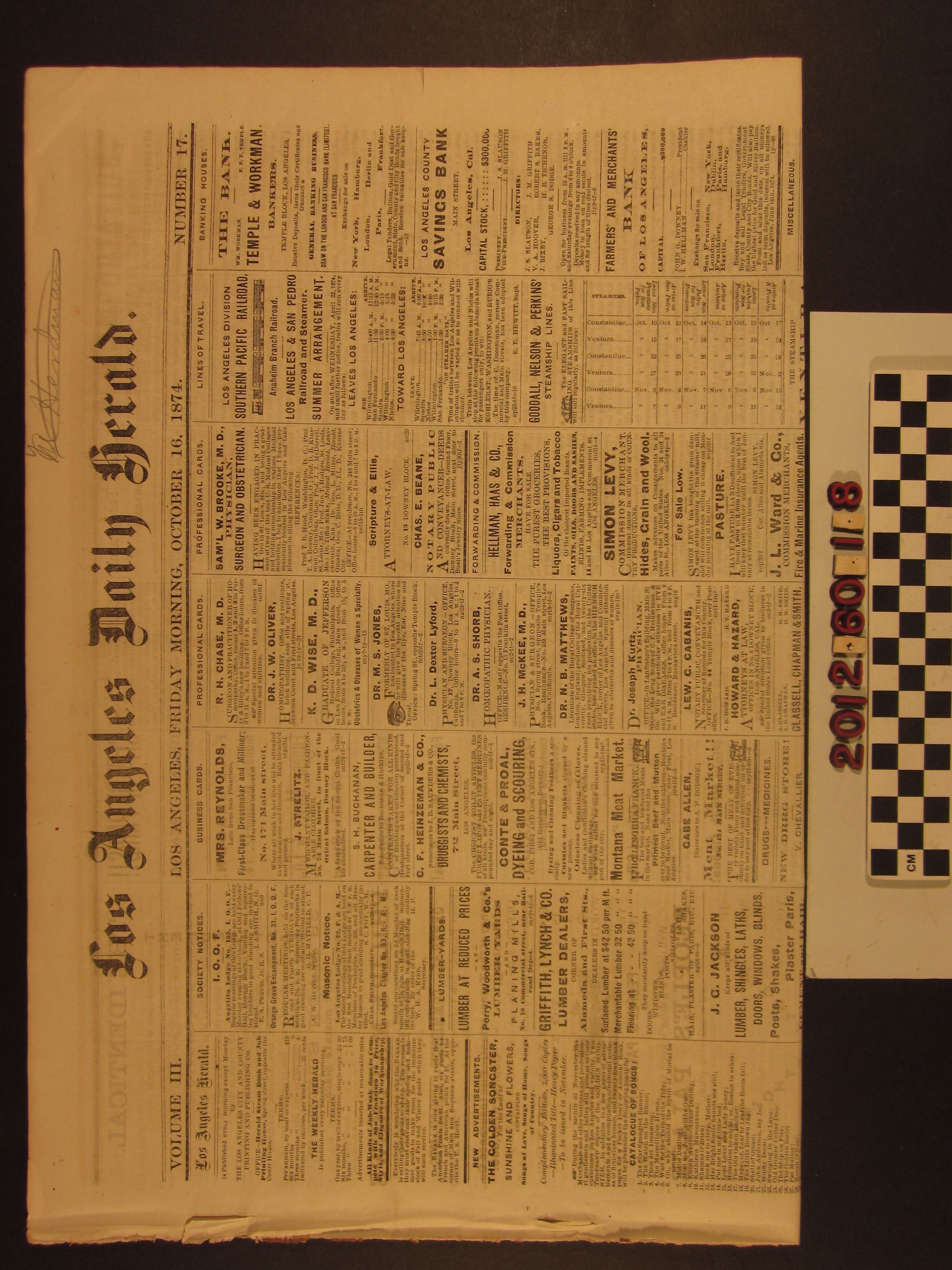 "Los Angeles Herald," 16 October 1874. The condition is good.