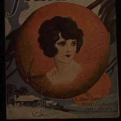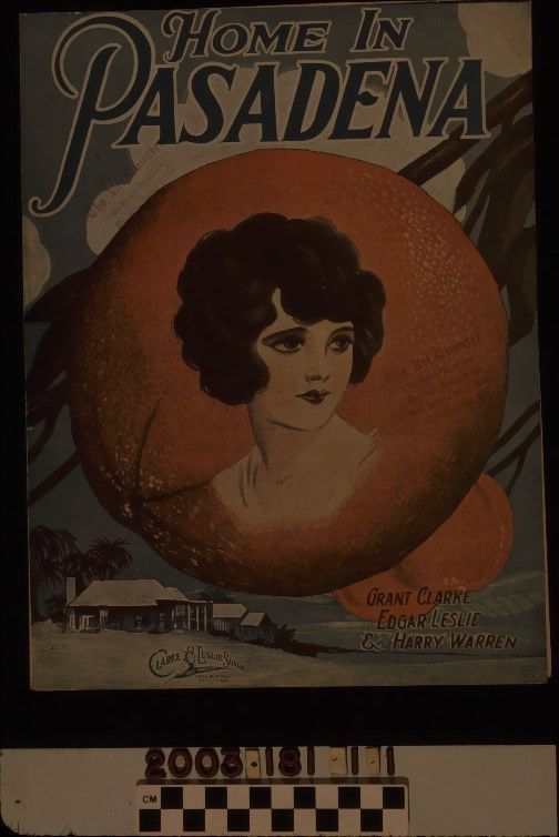 Sheet music, "Home in Pasadena," lyrics by Grant Clarke and Edgar Leslie and music by Harry Warren, published by Clarke & Leslie Songs, 1923. On the cover is the title at the top, the composers' names at the bottom right, with the publisher's information at the bottom left, and an image of a young woman on an orange, while a bungalow and palm trees are at the lower left. The transcription for the song, which is in moderato tempo, is for piano and voice. On the back cover is a sample of another song offered by the publisher. In two places on the front cover is a stamp for a music store. With light creases and surface soiling, some page browning, a small fold on page three, and a small tear at the bottom center of the back and on page three along the right near the bottom, the object is in good overall condition.Lexicon