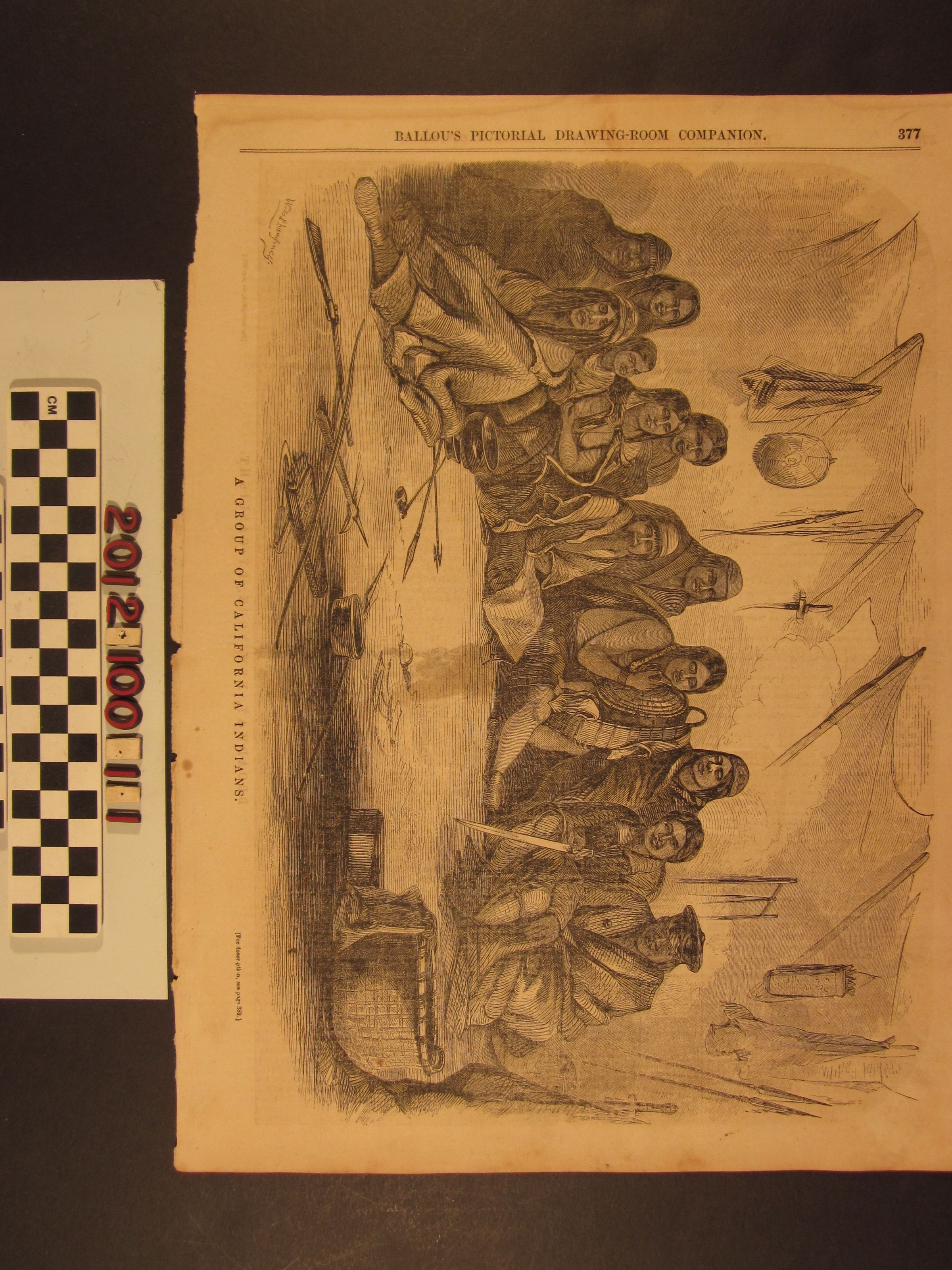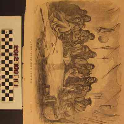 "A Group of California Indians," from "Ballou's Pictorial Drawing-Rom Companion," December 1856. The image shows a dozen persons inside a dwelling. There are a variety of implements, baskets, hides, weapons, bowls and clothing depicted, showing native and foreign influences. There is a reference to text on another page that was not included with the accession. With edge tears, soiling, an area or two of foxing, liquid stains and edge rubbing, the condition is fair.