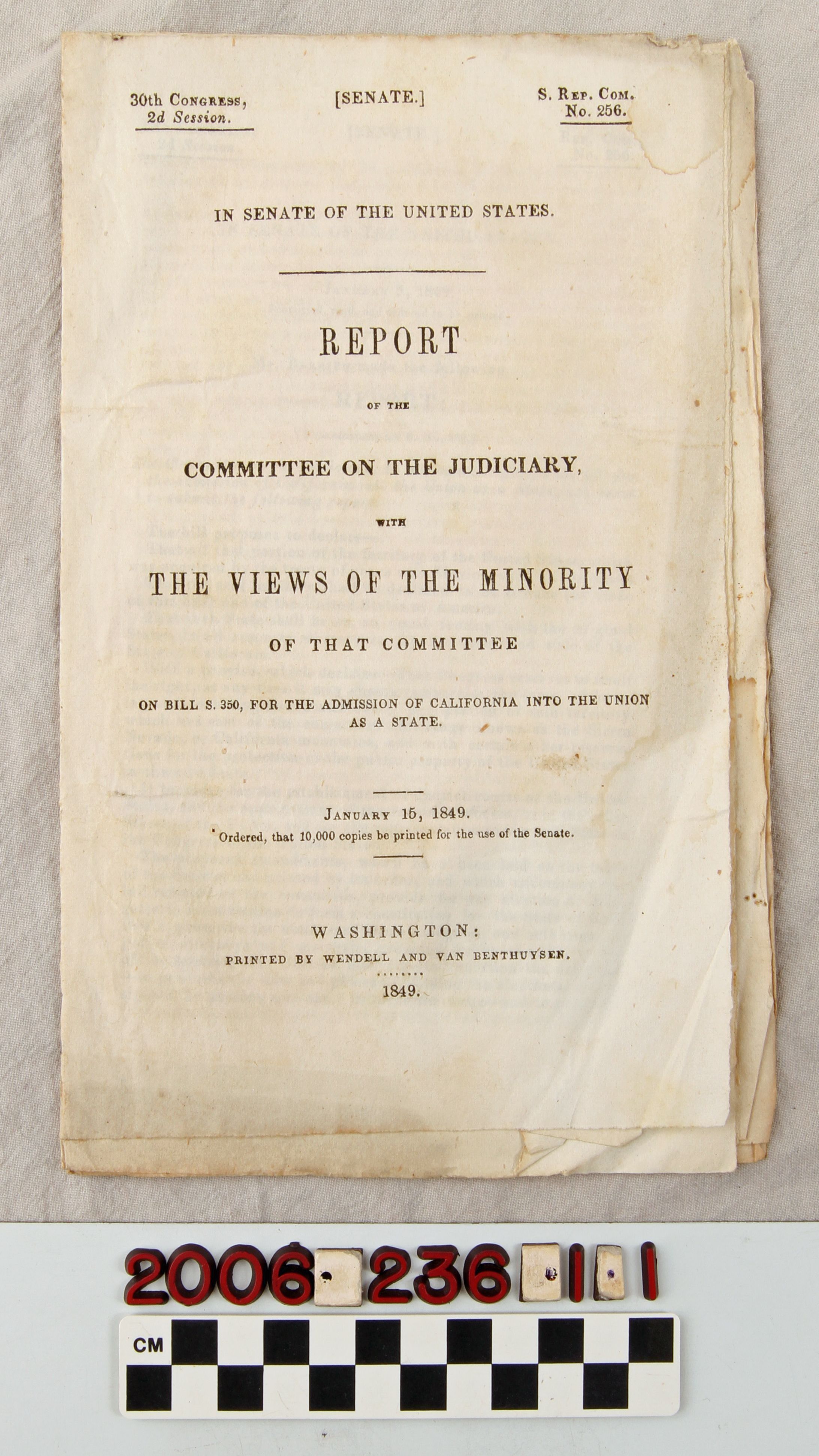 "Report of the Committee on the Judiciary with the Views of the Minority of that Committee on Bill S. 350, for the Admission of California Into the Union as a State," 30th Congress, 2nd Session (S. Rep. Com., No. 256), 15 January 1849 (Washington: Wendell and Van Benthuysen,) 1849. The document consists of the majority opinion that the bill, which proposed to include all territory assumed from Mexico in the recent war should be one state of California, be rejected, while the minority report, which follows, supports the bill. With liquid stains, discoloration, edge tears, creases, and stains, the overall condition is fair.Lexicon