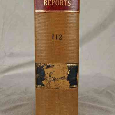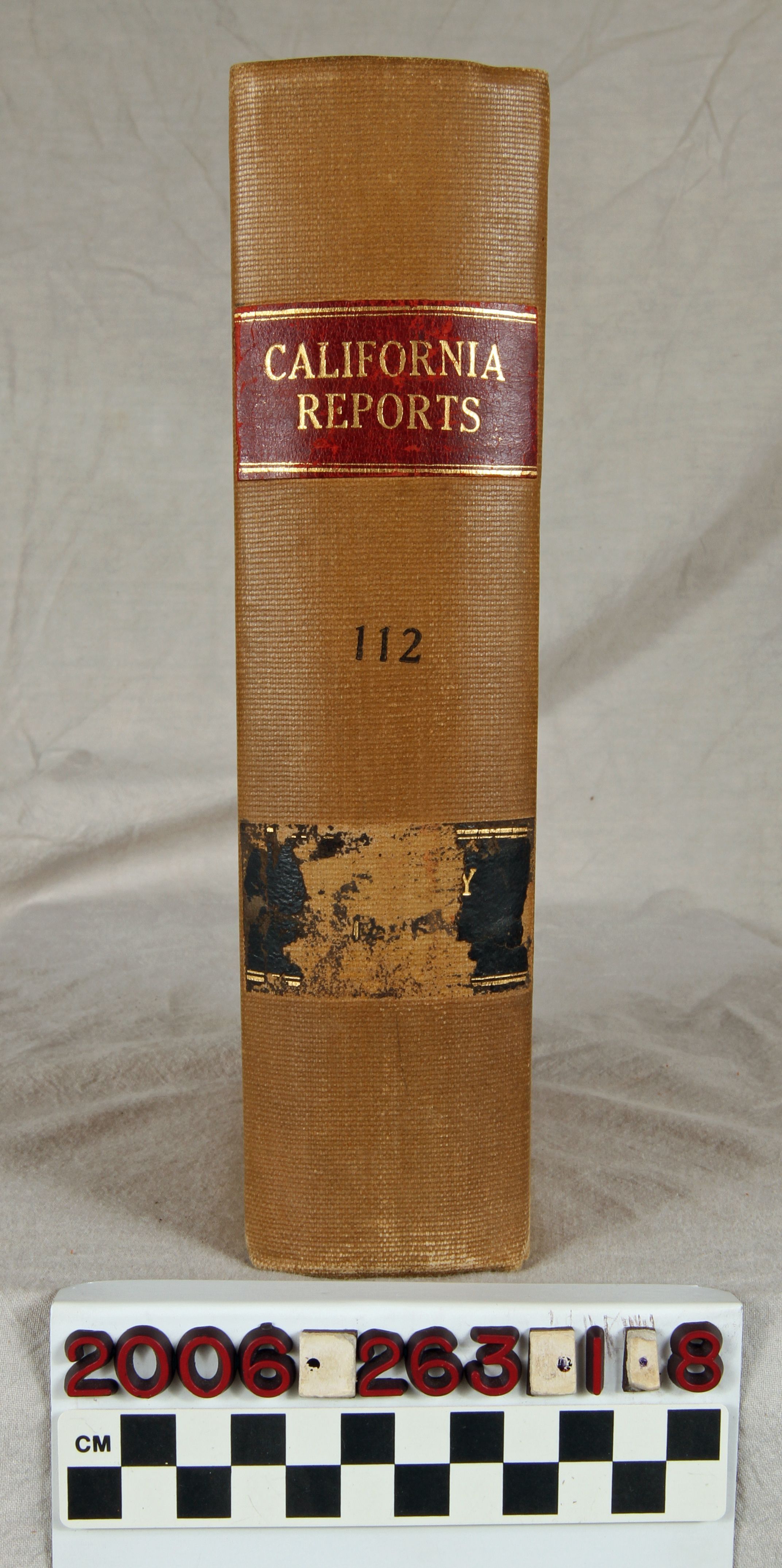 "California Reports," Volume 112, 1896 (San Francisco: Bancroft-Whitney Company,) 1897. The work contains the reported cases, as well as a list of justices and officers, organization of the court and court commissioners, a list of superior court judges, tables of cases reported and not reported, a table of cited cases, a statute of code citations, and an index . The covers have flaking, rubbing, abrasions, scratches, soiling, and a loose spine, while the pages are relatively clean and tight, so the general condition is fair.