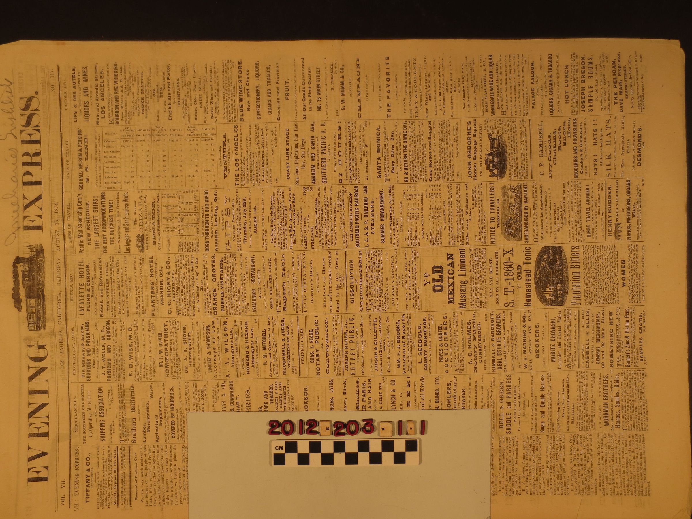 "Los Angeles Evening Express," 15 August 1874. The overall condition is fair.