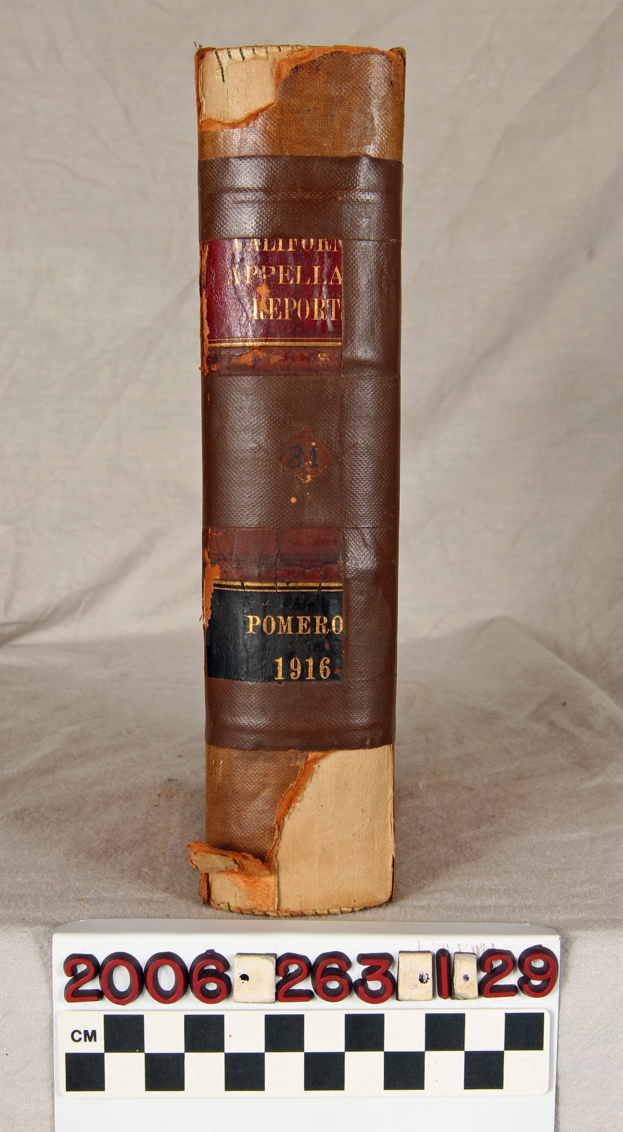 "California Appellate Reports," Volume 31, 1916 (San Francisco: Bancroft-Whitney Company,) 1917. The work contains the reported cases, as well as a list of justices and officers, tables of cases reported and not reported, a table of cited cases, a statute of code citations, and an index . The covers have rubbing, abrasions, scratches, and soiling, while the pages are relatively clean and tight, so the general condition is poor.Lexicon