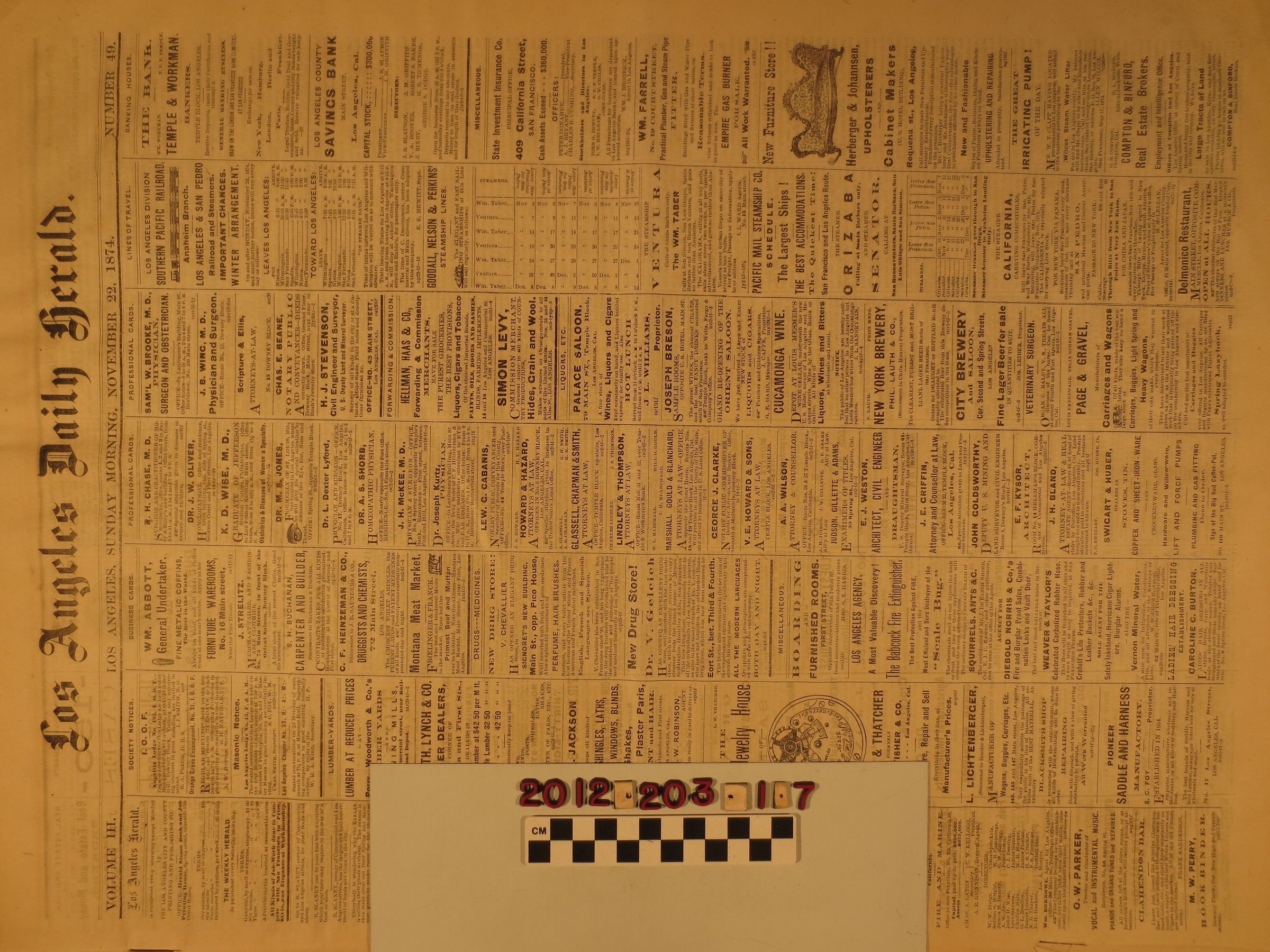 "Los Angeles Daily Herald," 26 November 1874. The overall condition is fair.