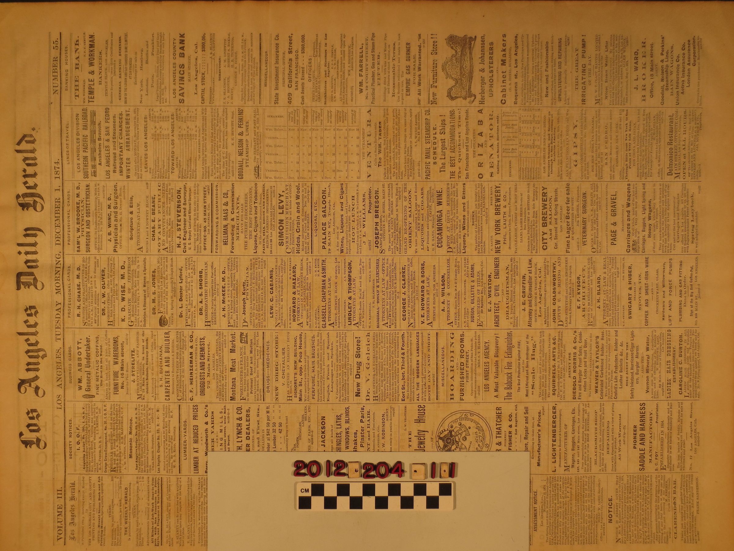 "Los Angeles Daily Herald," 1 December 1874. The overall condition is fair.