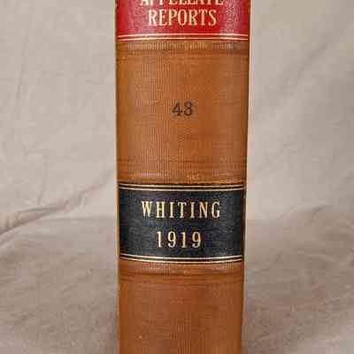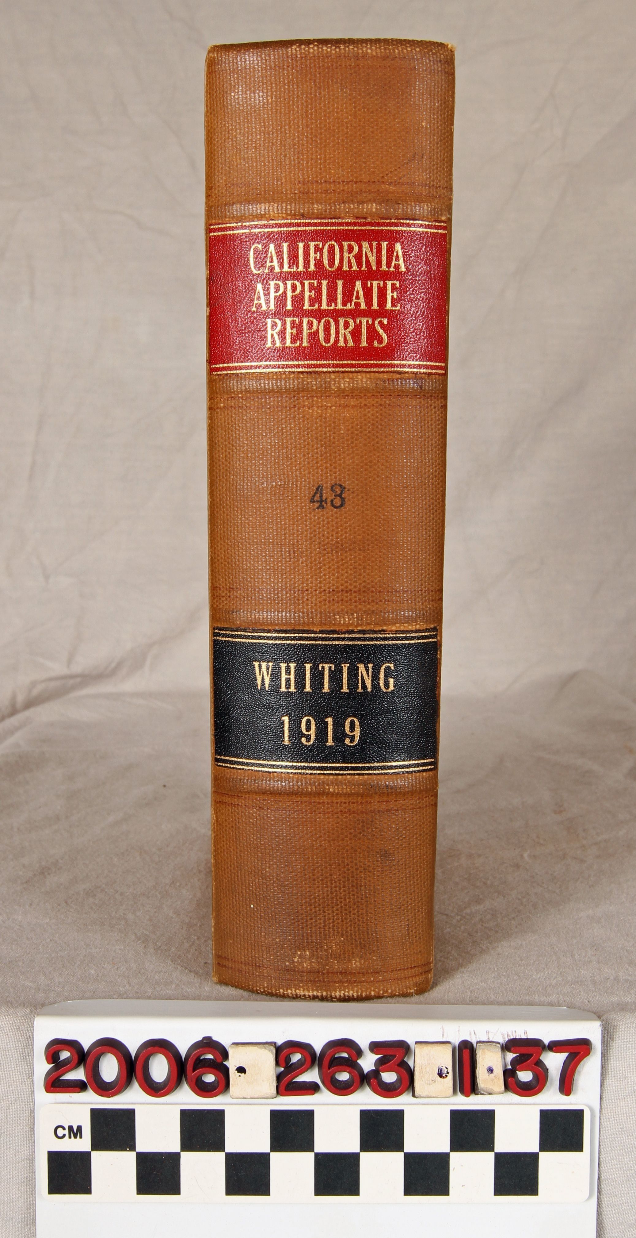 "California Appellate Reports," Volume 43, 1919 (San Francisco: Bancroft-Whitney Company,) 1920. The work contains the reported cases, as well as a list of justices and officers, tables of cases reported and not reported, a table of cited cases, a statute of code citations, and an index . The covers have rubbing, abrasions, scratches, and soiling, while the pages are relatively clean and tight, so the general condition is fair.Lexicon