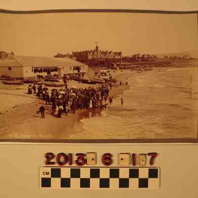 A cabinet card photograph, "No 386 Redondo Beach," unattributed but assumed to be W. M. Graham, ca. 1890s. The view looks southward to a large crowd at the water's edge; water craft on shore by the casino; a large hotel in the upper center with people on the sand and in the water near it; the pier; and a few houses down the coastline. The number, title and photographer's surname are in white at the bottom and the image is pasted down to a gray photo album page. With warping and minor soiling, the condition is good.