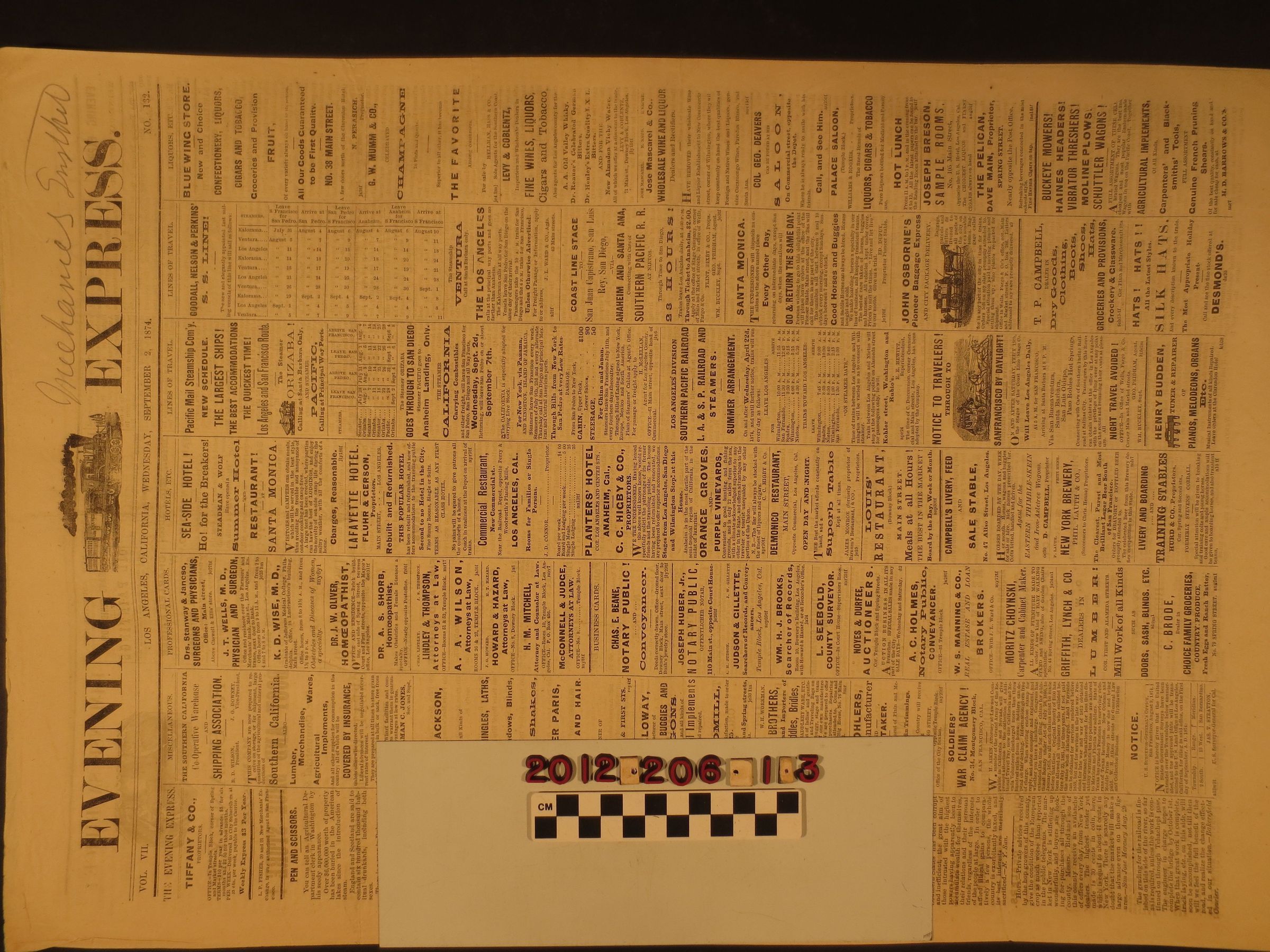 "Los Angeles Evening Express," 2 September 1874. The overall condition is fair.