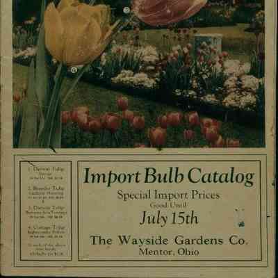 "Import Bulb Catalog," issued by the Wayside Gardens Company, 1926. The 31-page booklet has a white paper cover with a color drawing at the top of the front of a garden with many flowers and bulbs at the foreground. At the right of the background behind a tree is a brown house. Listed at the left of the bottom are the names of the bulbs in the illustration. At the right of this is the title and name of the company. All of the lettering is in black. On the back is a color-tinted photograph of a garden with the name of the company across the center of the bottom. At the beginning of the inside are instructions for the planting and growing of bulbs as well as a special offer. There are a wide variety of flowers available for sale with names like Darwin, Zulu, Viola, Eros, and California, among others. At the back is a timetable for the planting of plants and bulbs. There are many black and white drawings and photographs included. With abrasions, creases, surface soiling, light stains, and small tears, the object is in overall fair condition.Lexicon