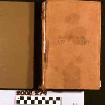 "Acts Amendatory of the Codes, Passed at the Twentieth Session of the Legislature, 1873-74," (Sacramento: G. H. Springer, State Printer,) 1874. The 501-page book consists of the amendments to the state political, civil, civil procedure, and penal codes of California. There is a table of contents, followed by the texts of the acts, and concluding with indices of each code type. The loose front cover is item b). There are stamps from a law library. With heavy damage through cover rubbing; acid burns; brittleness; leather corrosion, flaking and cracks; creased pages; dented corners; soiling; page browning; cover discoloration; the loose over; losses to the spine; stains; tears; and overall wear, the condition is poor.Lexicon