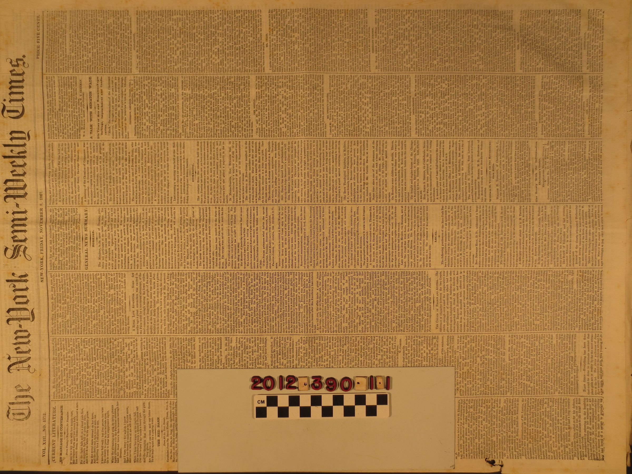 "New York Semi-Weekly Times," 8 November 1867 (Vol. 13, No. 1372.) The newspaper contains an article in columns 4-6 of page 6 consisting of a dispatch from Los Angeles, dated 1 September from "C.L.B.." It has a notable description of Los Angeles and environs, with striking characterizations of the people and undeveloped nature of the area, as well as detailed observations of agriculture and viticulture, especially a visit to the estate of Benjamin D. Wilson and shorter visits to Phineas Banning, Mathew Keller, Pierre Sainsevain and the Wolfskill orchard. Mention is also made of the diminution of crime and lawlessness in the town the correspondent called the "Botany Bay of California and Mexico." The author was Charles Loring Brace, a noted social reformer in New York who visited California after contracting typhoid fever and was in the state from late Spring to October, with his notes resulting in the book, "The New West," published in 1869. With tears, foxing, soiling and creases, the condition is fair.