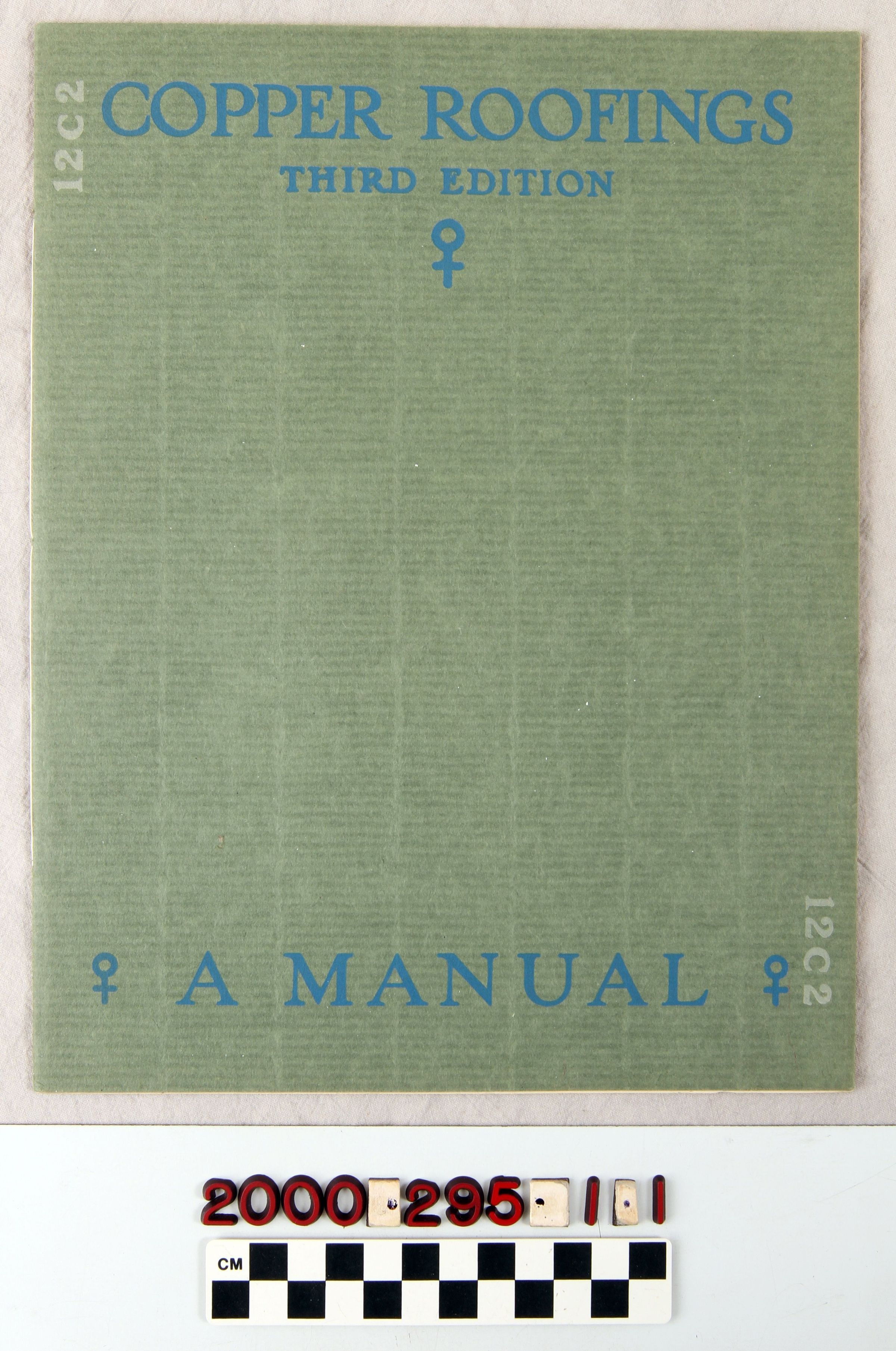 Color: Blue; Green "Copper Roofings," issued by the Copper and Brass Research Association, 1929. The 26-page manual has a green paper cover with the title across the top of the front. Across the bottom is, " A MANUAL." All of the printing on the cover is in blue ink. At the front of the inside are a title page, an introduction, and an indexed table of contents. The booklet has many sections that cover such subjects as installation; cornices; drains and their function; fastenings; gutters; leaders; nails; roofs; seams; sheathing; skylights; valleys; and much more. Some line-drawings are included. With light dents at the corners and a slight musty odor, the artifact is in good condition.