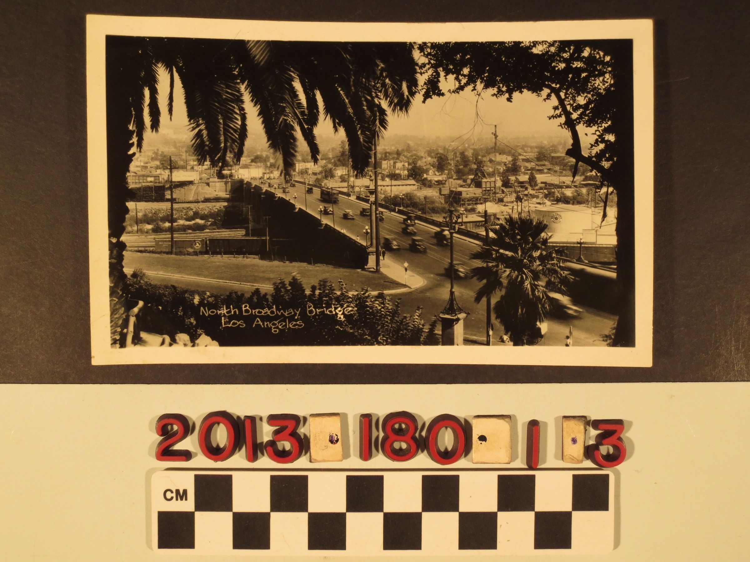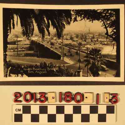 "North Broadway Bridge, Los Angeles," ca. 1920s. The view is taken from an elevated position under some trees and looks toward the bridge spanning the Los Angeles River north of downtown. Automobiles and streetcard are on the bridge and, in the distance, are areas of the city near Lincoln Heights and surrounding communities. With minor soiling, warping, and abrasions to the edges, it is in good condition.