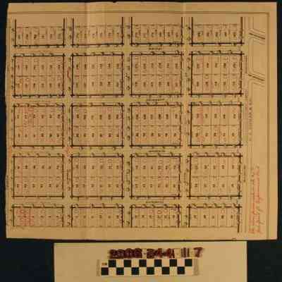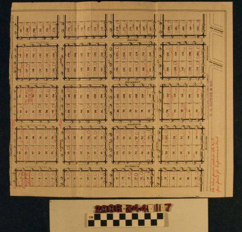 "R.A. Rowan and Co.'s Windsor Square," ca. 1921. The map is trimmed down to the southern portion of the 200-acre area is shown, bordered by Third Street on the north to Wilshire Boulevard on the south and from just west of Plymouth Avenue on the west to east of Irving Boulevard on the east. This map consists of lots arranged on straight, linear streets and was cut after the portion north of Third Street was sold and separately subdivided as New Windsor Square (see later maps in the accession). An area to the left that had included some text and contact information for the developer was also trimmed. There are stamps at the bottom reading "Windsor Square Investment Company" and "R.A. Rowan & Co." This edition shows that most lots were sold, except for some on the extremities at Wilshire and Third and showing a few more sold than in the map that is item .6. With original folds, minor creases and some edge wear, the general condition is fair.Lexicon