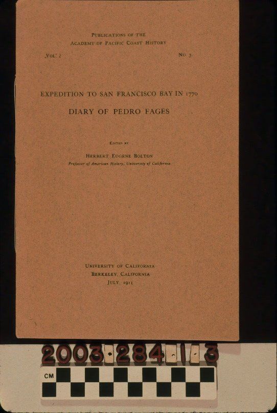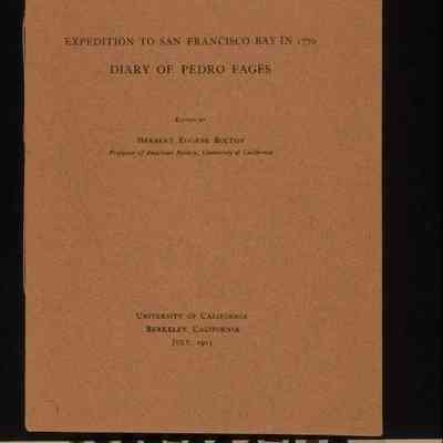 "Expedition to San Francisco Bay in 1770: Diary of Pedro Fages," Volume 2, Number 3 of the Publications of the Academy of Pacific Coast History, University of California, Berkeley, California, July 1911. The 19-page work has a brown paper binding with the series title, volume and number, title, author's name, publisher's name, and date on the front. After an introduction is the translation of Fages' diary with the Spanish of the original and the English translation on facing pages, covering Fages explorations from Monterey to the Bay of San Francisco and back. Also included is the text of a letter from Fages to the Viceroy of Mexico reporting on his explorations. On the inside back cover is a list of current and future publications in the series. With spine abrasions; slight cover creases; page yellowing; stains at the top of the back cover; and staple tarnish, the overall condition is good.Lexicon