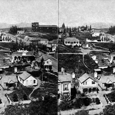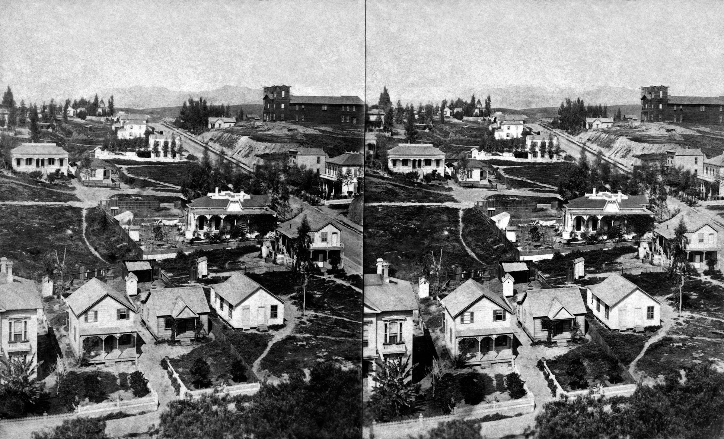 STEREOSCOPIC PHOTOGRAPH, "3071 TEMPLE ST., LOS ANGELES," Payne, Stanton & Co., Los Angeles, ca. 1882. The view is westward from downtown toward the Bunker Hill area and the section is mainly residential, with one and two-story frame houses along Temple as well as north-south streets. At the back right, however, appears to be a church or other larger structure. In the distance is a section of the Santa Monica Mountains. With heavy staining, edge and corner wear and some small torn sections, the condition is fair.Lexicon