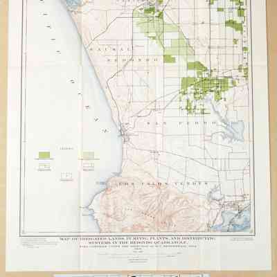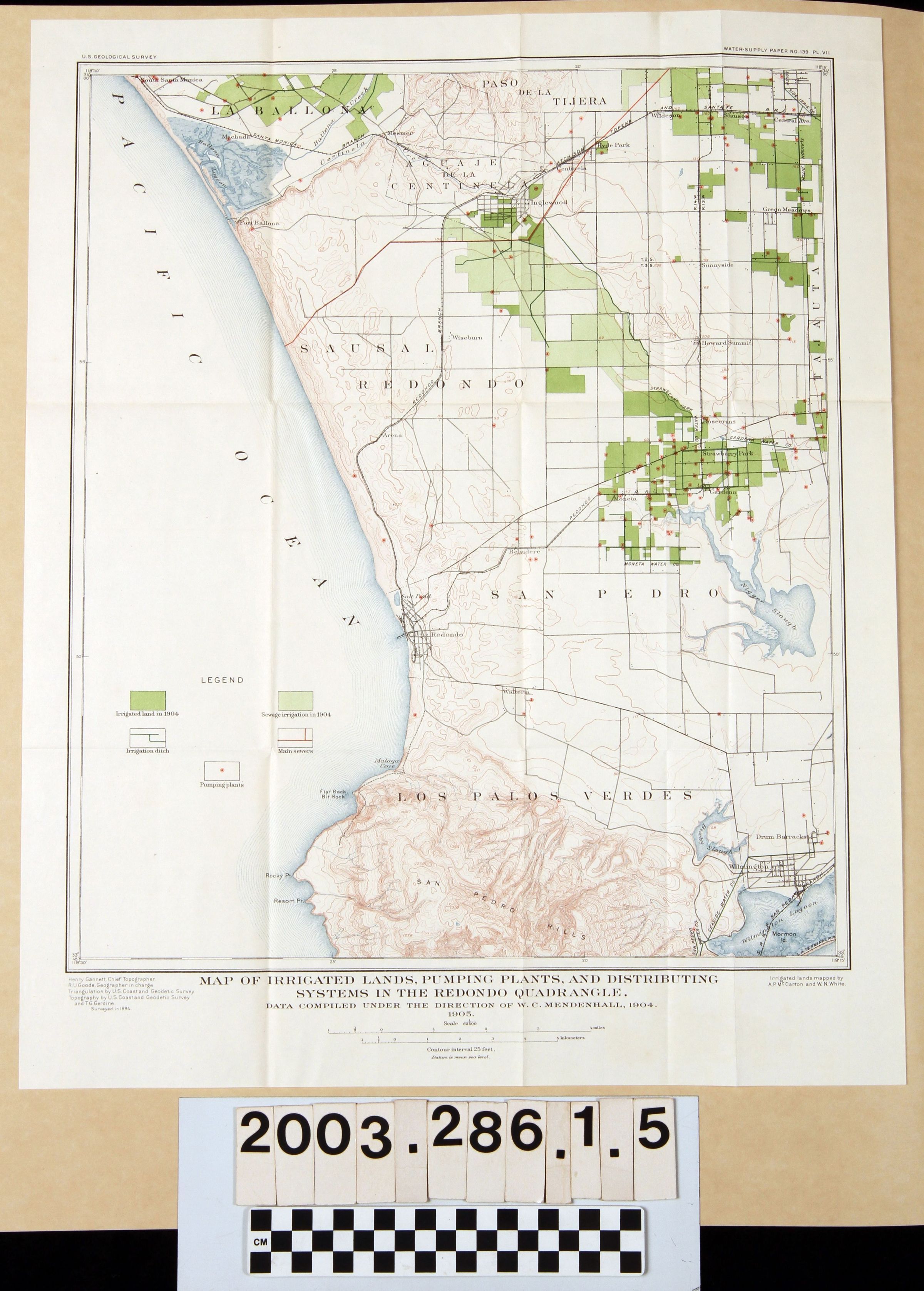 "Map of Irrigated Lands, Pumping Plants, and Distributing Systems in the Redondo Quadrangle," by the U. S. Geological Survey, 1904. The map shows an area from the Ballona wetlands to Palos Verdes on the west to South-Central Los Angeles and Wilmington on the east and from Inglewood on the north to the San pedro Harbor on the south. Features as cities and towns, historic rancho names, rivers and lakes, mountain and hill ranges, and other physical indicators are given. But, the subject of the map are areas in shades of green indicating regular and sewage irrigated land, irrigation ditches (in blue lines), main sewers (in red lines), and pumping plants (in red circular marks.) At the bottom is the title and scales in miles and kilometers. Other than the original folds and slight paper yellowing, the condition is good.Lexicon