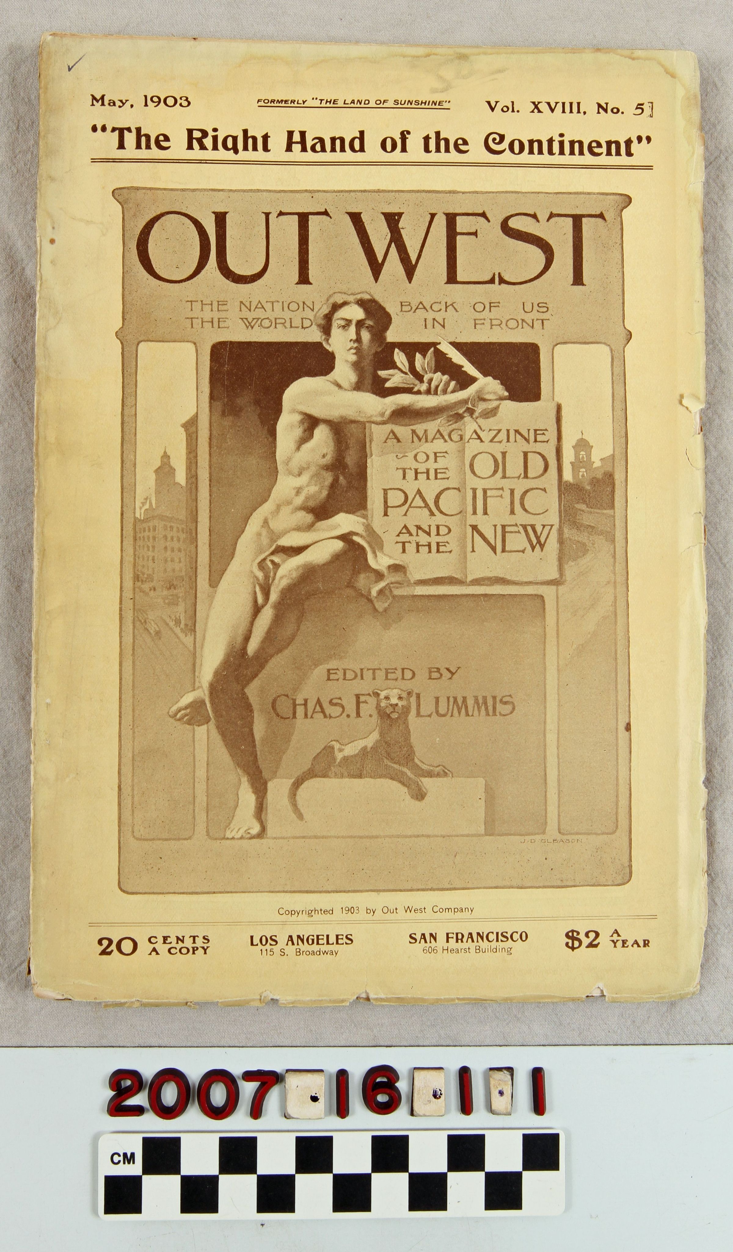 "Out West," Vol., XVIII, No. 5 (May 1903), edited by Charles F. Lummis and published by Out West Magazine Company, Los Angeles. The magazine contains articles on the history and development of California and the West, travel articles, fiction and poetry, and others. There are illustrations and many area-related advertisements. With edge wear, scratches, damaged spine labels, and other wear to the covers and yellowing to pages, the condition is fair.Lexicon