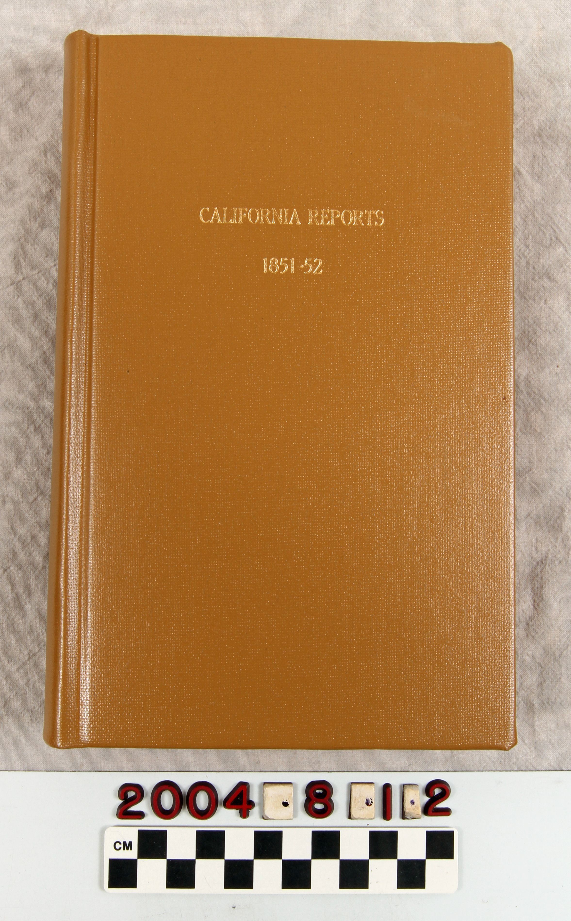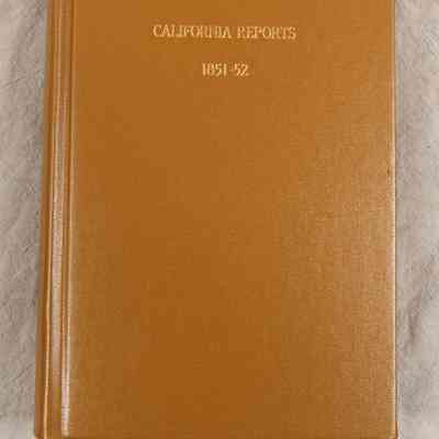 "Reports of Cases Argued and Determined in the Supreme Court of the State of California in the Year 1852 [Volune 2]," by H. P. Hepburn (San Francisco: Bancroft-Whitney Co.,) 1886. A reprint of the original report by Hepburn, the court reporter, the work has a leather cover with the spine missing. After a list of the judges in the Court, as well as the state Attorney General, there is an alphabetical index of cases, which is followed by the reports and an index. With severe cover damage of many kinds, as well as acid burns, brittleness, discoloration, flaking, stains, and tears to pages, the condition is poor.Lexicon
