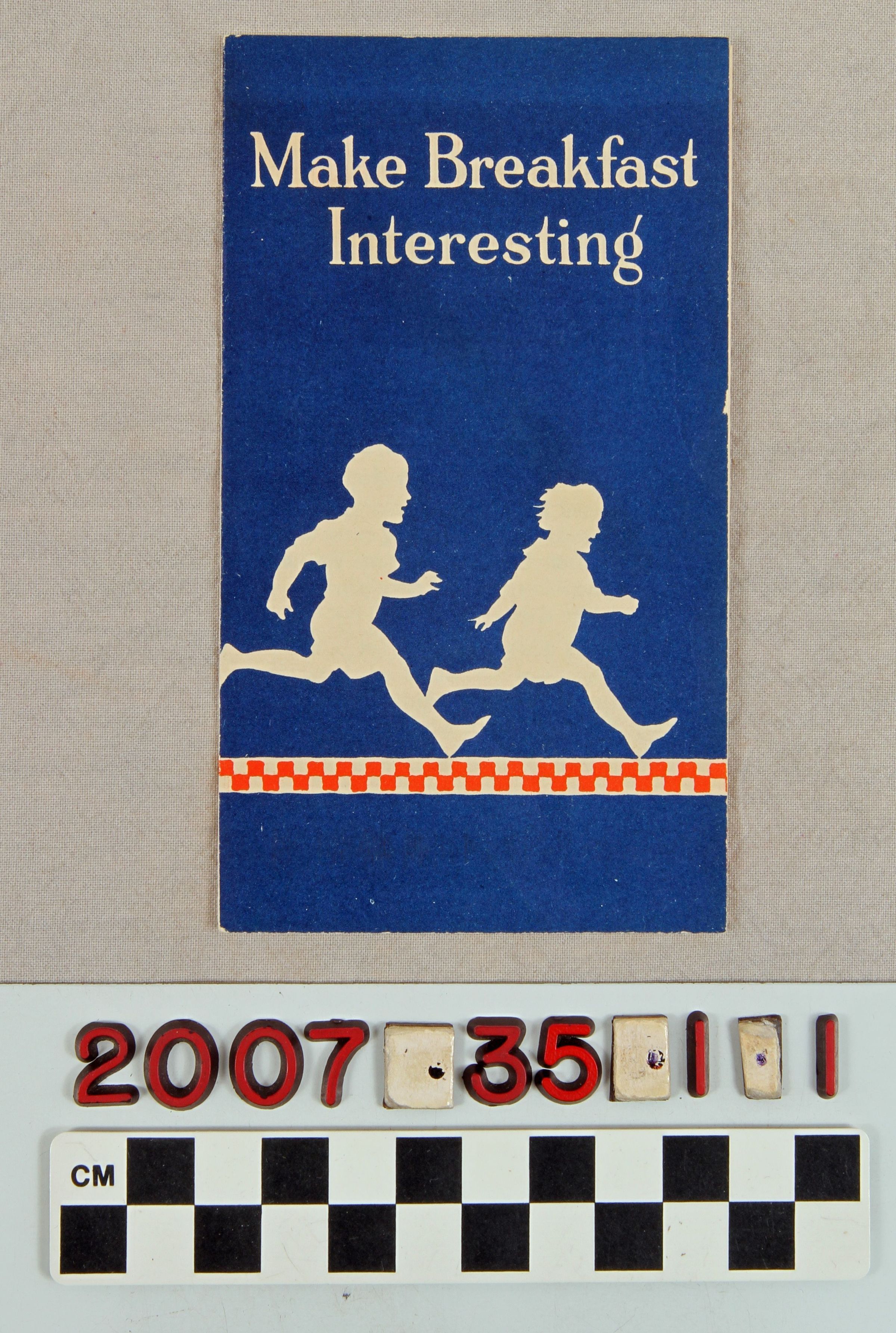 "Make Breakfast Interesting," by Ralston Purina Company, 1928. The item contains description about company breakfast products with a panel for each day of the week and a specific product. There is also an order form a free booklet for mothers. Aside from some creasing and edge wear, the condition is good.Lexicon
