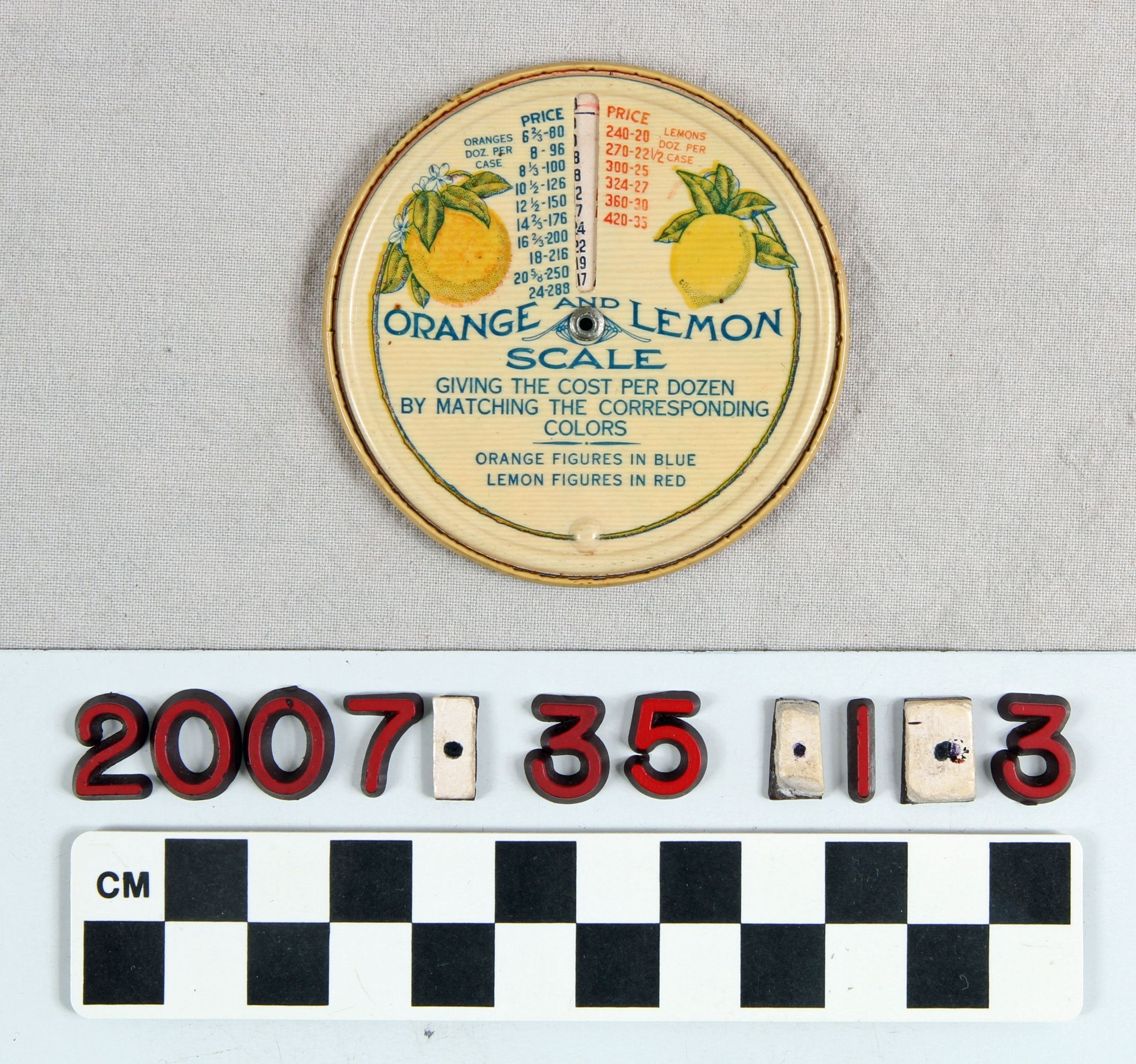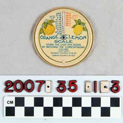 "Orange and Lemon Scale," issued by California Fruit Growers Exchange, Los Angeles, ca. 1920s. The item has a rotating dial with preprinted prices for lemons in red and oranges and blue on either side so that the cost per dozen can be calculated. There are also images of the two fruits. On the other side is a "compliments of" statement from the Exchange and the "Sunkist" brand. With yellowing to the celluloid, stains, and scratches, the overall condition is good.Lexicon