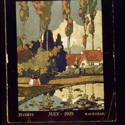 Magazine - THE HOUSE BEAUTIFUL, Vol. L, No. I, July 1921, Concord, NH: The House Beautiful Publishing, Co., 76 pages, many illustrations, few photographs, two metal staples at spine, cover shows three women beside pond, house in background, contents include shopping guide, curtains, gardens, home builders guide.Lexicon