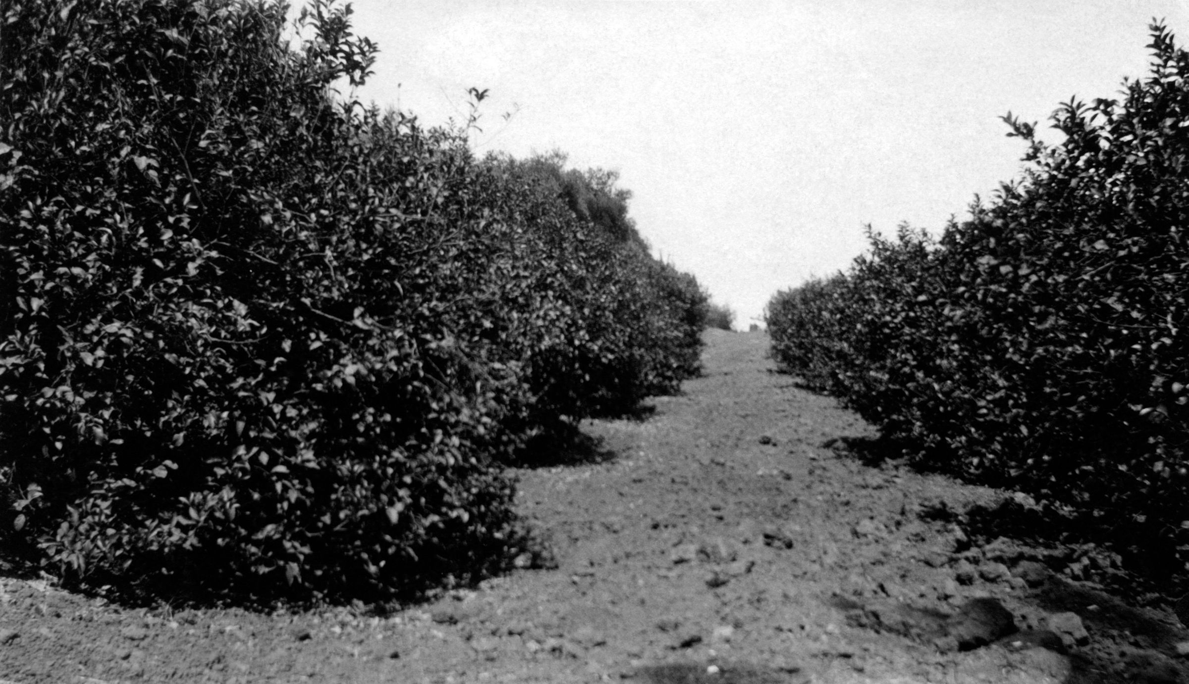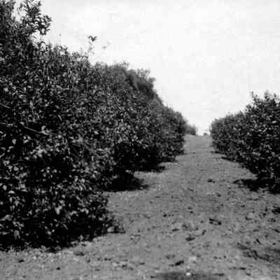 "Orange Grove, Hollywood, Calif.", 1920s. The image is of two rows of trees with an aisle at the center. On the reverse is an inscription: "Orange Trees, Laughlin / Park, Hollywood, California." With some mounting corner residue and slight soiling, the condition is fair.