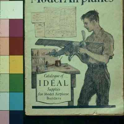 Color: Blue; Brown "How to Build and Fly Model Airplanes," issued by the Ideal Aeroplane & Supply Co., Inc., 1928. The 64-page catalog has a light-blue paper cover with the title at the top of the front. Written in pencil on the top left corner is "ALBERT / COOPER," while on the opposite corner is, "HARRY / MILLER." At the center is a blue and brown drawing of a young man in slacks and a short-sleeve shirt who stands by a work table. In his hands he holds a biplane model. Within a shield on the bottom left is, "Catalogue of / IDEAL / Supplies / for Model Airplane / Builders." On the back is an illustrated advertisement for the products with text that provides reasons for model-building. All of the printing on the covers is in dark blue. At the beginning of the inside are a title page; table of contents; index; and articles on the history of aviation, airplane types, and learning about aeronautics through model-building. There are a variety of model kits listed for such airplane types as sea, French Scout, Fokker, gliders, and more. Miniature radiators, wheels, propellers, liquid cement, and other parts and supplies are also listed. The artifact is fully illustrated with line-drawings and some black and white photographs. With many abrasions; brittleness; creases and dents; discoloration; soiling; stains; and tears, the object is in poor condition.